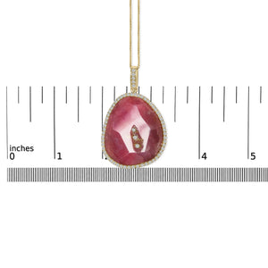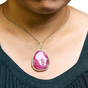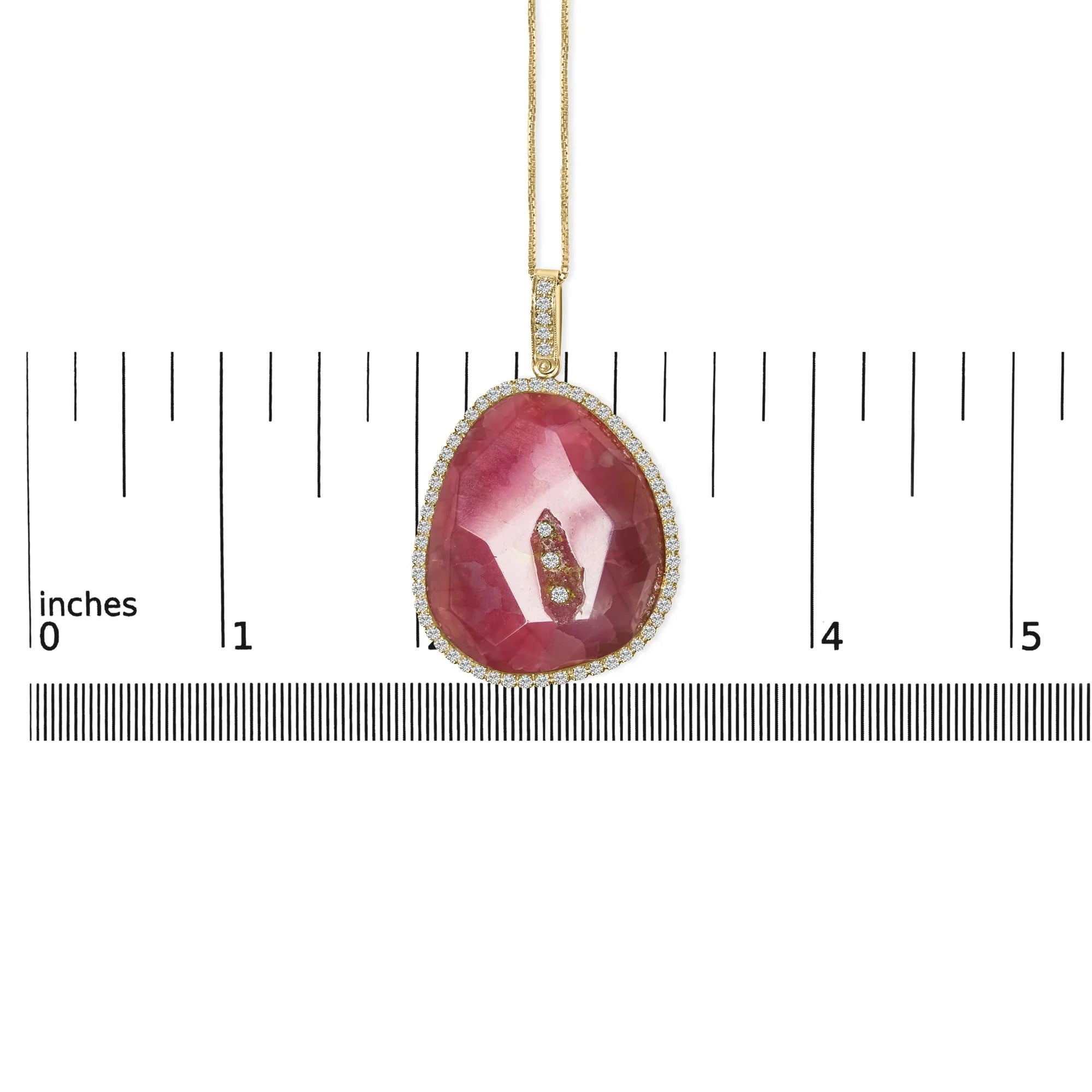 Envelop yourself in the radiance of this enchanting 18K yellow gold necklace, where nature's artistry meets human craftsmanship. At the heart lies a captivating 42.0 carat pink quartz, its tender hues enhanced to dazzle the eye, epitomizing both purity and drama through its striking natural inclusions and a vivid central crack. Encased within this geologic marvel are three exquisite diamonds, nestled effortlessly, their brilliance accentuating the organic allure. A halo of 1.0 carat diamonds, with F-G color and VS1-VS2 clarity, crowns the quartz, each gemstone reflecting light in a dance of sparkle and sophistication. This gemstone, treated to highlight its mesmerizing pink tones, contrasts beautifully against the luxurious yellow gold chain that promises both elegance and security with its sturdy lobster clasp. Designed not merely as a piece of jewelry but as a symbol of grace, each wear will remind you of the beauty found in the unique tapestry of the natural world.