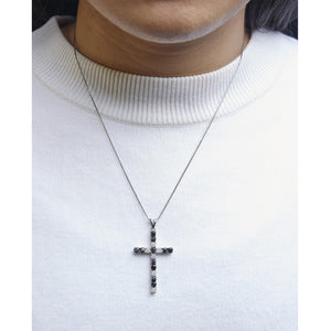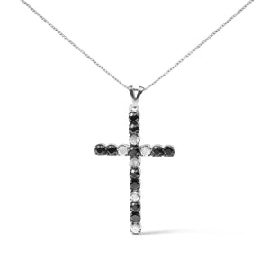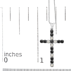 Imbued with a serene elegance, this cross pendant necklace marries the timeless allure of sterling silver with the enigmatic contrast of black and white diamonds. With a total weight of 1.0 carat, the stones natural, round-cut diamonds in black and white hues alternate in a delicately orchestrated symphony along the arms of the cross. The black diamonds, placed thoughtfully at the edges, encase the luminous I-J color, I3 clarity white diamonds that draw the eye inward, creating a mesmerizing focal point. Elegantly crafted, the pendant hangs from an 18-inch sterling silver chain, polished to mirror brightness, assuring that the piece rests gracefully at the collarbone, enhancing any neckline it graces.