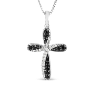This is a great alternative to the classic cross necklace. A sterling silver ribbon loops to create this continuous cross design. 1/4ct TDW of white and black, color treated, round cut diamonds glisten in this pendant that dangles from a cable chain and secures with a spring ring mechanism.