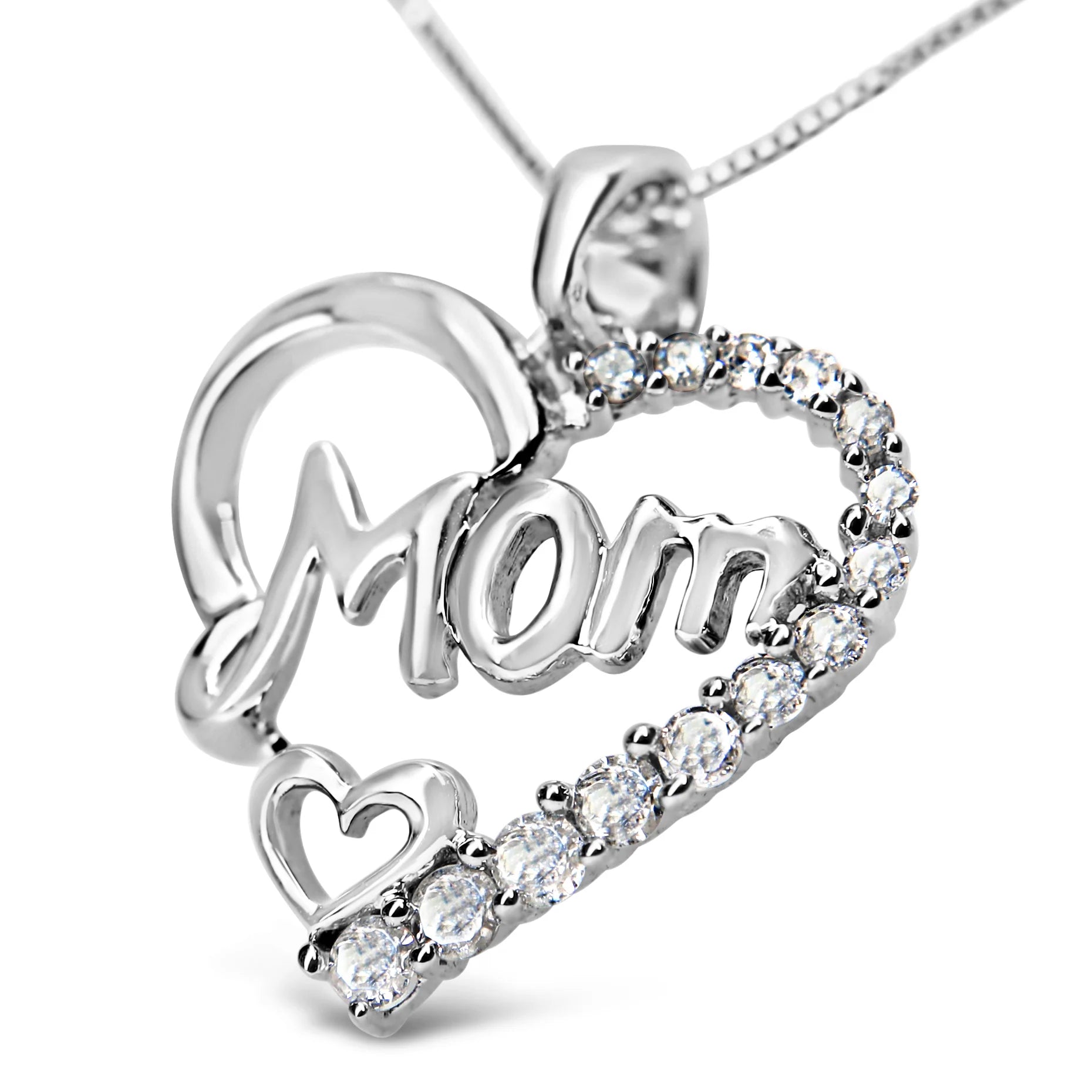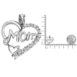 Give mom the gift of diamonds to show your appreciation for all that she has done and for all the ways you love her. This charming heart pendant is crafted from .925 Sterling Silver and features an open design with the word "mom" scripted in cursive at the center of the heart. Along the side of the heart are sparkling white diamonds in prong-settings in a gradual size descent. These diamonds are a total 1/4 cttw and are of an approximate I-J color and I3 clarity. The contemporary yet classic 18" box chain complements any neckline beautifully and secures with a spring ring clasp.