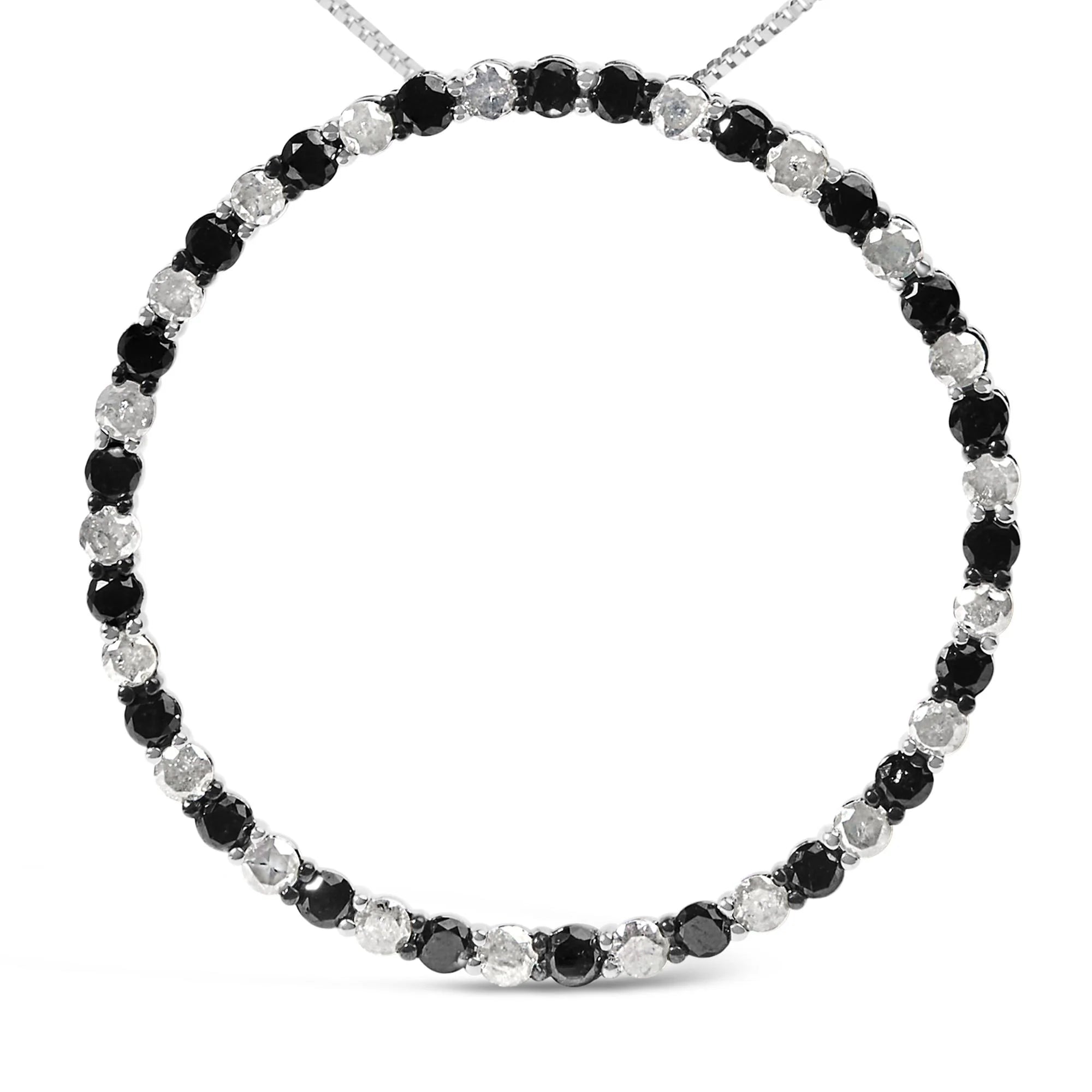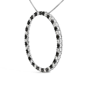 Discover elegance redefined with this exquisite pendant necklace, skillfully crafted from rhodium-plated .925 sterling silver. Its captivating circular design, featuring a harmonious arrangement of 3.0 carats of round-cut natural diamonds, celebrates the contrast between the sumptuous, enhanced black diamonds and the luminous brilliance of traditional white diamonds. Each stone has been meticulously selected and set to showcase their unique tantalizing sparkle and rich, seductive hue. The 18-inch box chain falls gracefully around the neckline, providing a tasteful and secure adornment with its classic spring ring clasp. An emblem of sophistication, this piece bridges the gap between contemporary chic and timeless grace, perfect for adding a touch of glamour to every occasion.