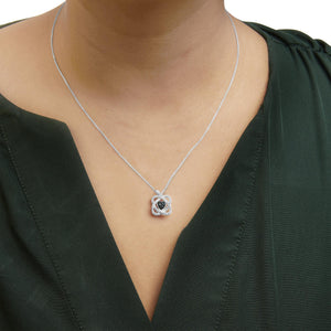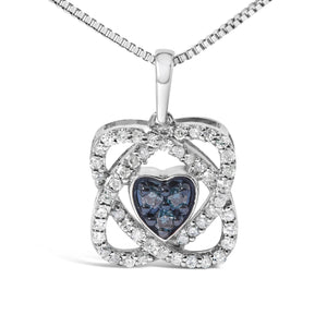Elegance and emotion perfectly intertwine in this exquisite .925 sterling silver necklace, crowned with a heart-shaped centerpiece bedecked in blue diamonds. Natural, earth-mined diamonds shine with an I1-I2 clarity, encapsulating timeless charm within their dazzling embrace. The sophisticated heart is framed by an intricately woven halo of alternating blue and white diamonds, each blue gem treated to enhance its deep, mesmerizing hue. Adding a unique touch, blue rhodium accents caress the prongs, enriching the pendant with a depth of color that speaks to the soul. Suspended from an 18-inch cable chain with a secure spring ring clasp, this necklace marries the spirit of romance with a whisper of mystery, making it your perfect companion for both grand evenings and intimate moments.