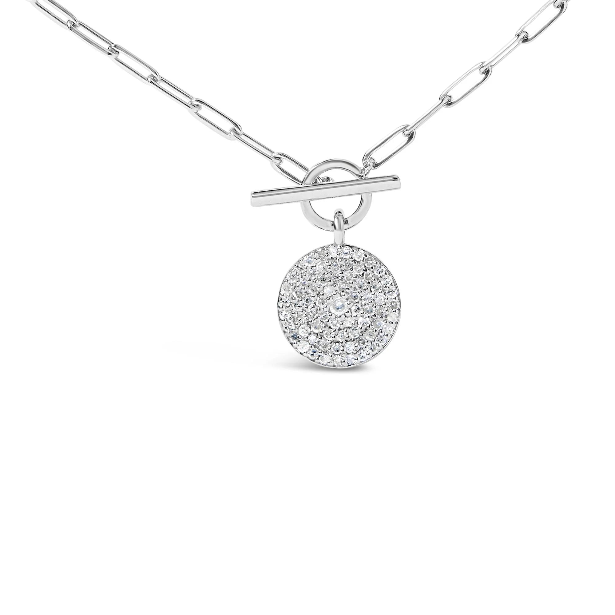Drape elegance around your neck with this radiant sterling silver necklace, featuring a meticulously crafted medallion pendant that pulsates with 3/8 carats of natural, earth-mined diamonds. Each diamond, with an H-I color and SI1-SI2 clarity, twinkles with a clear, celestial light, reflecting both sophistication and a touch of the divine. The pendant itself, encased in lustrous rhodium-plated .925 sterling silver, suspends from an alluring toggle bale, embodying classic grace with modern nuances. An 18-inch paperclip chain, which blends contemporary design with timeless allure, secures the ensemble with a dependable spring ring. This piece not only adorns your form but also enhances the very essence of any attire, making it a quintessential addition to your jewelry collection.