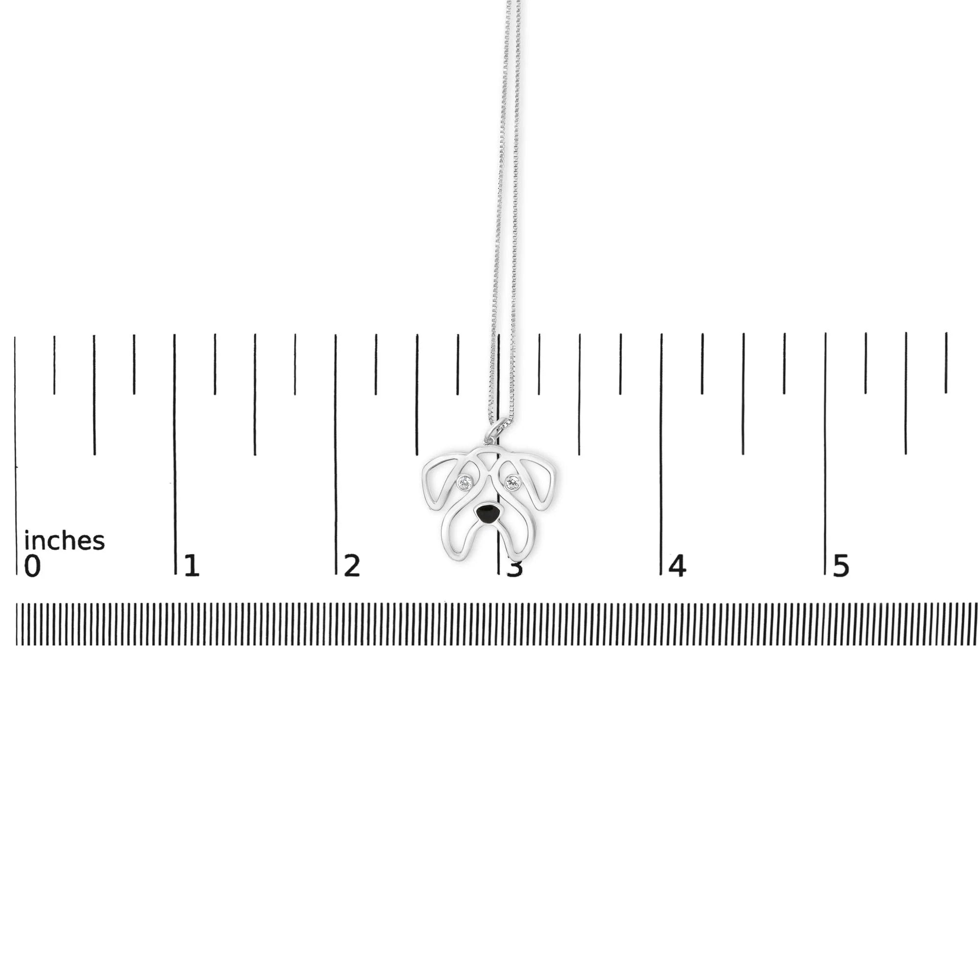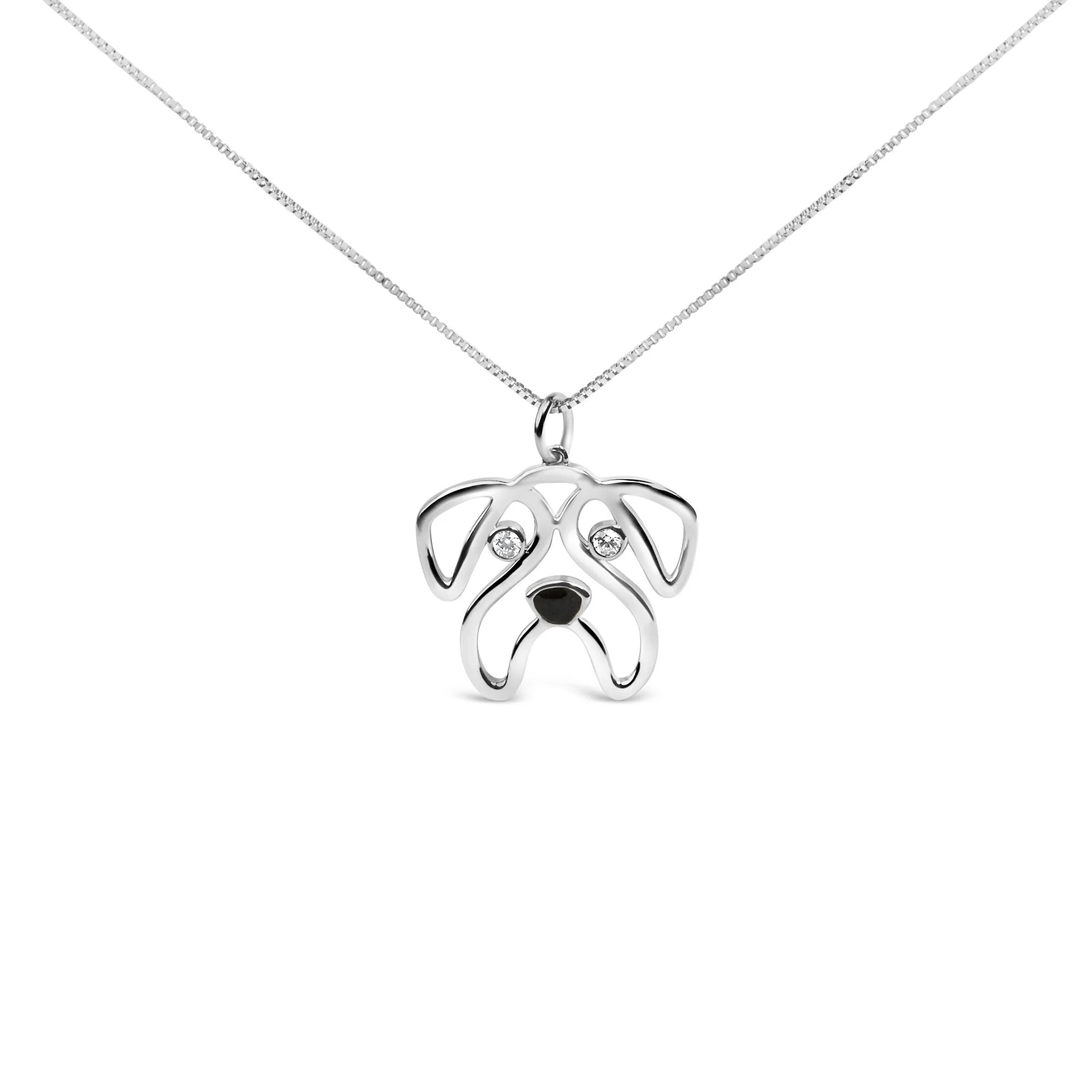 Celebrate your affection for the charming and affable pug with this exquisite .925 sterling silver pendant necklace, rhodium-plated to ensure an enduring sparkle and resistance against tarnishing. The pendant, a masterpiece of craftsmanship, captures the whimsical essence of a pug's face with intricate openwork that brings each feature to life. Its captivating eyes twinkle with natural white diamonds of I-J color and I2-I3 clarity, ensuring a subtle yet enchanting glimmer that mirrors the warmth of this beloved breed. A playful touch of black enamel defines the nose, enhancing the expressive character of the piece. Suspended from a sleek 18-inch box chain and secured with a sturdy spring ring clasp, this necklace promises to be a versatile and cherished addition to any jewelry collection.