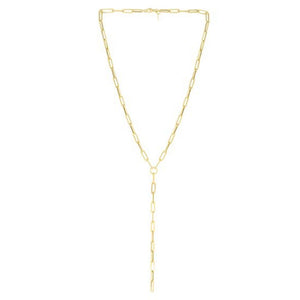 Gorgeous polished links of 14k yellow gold paperclip chain cascade like a waterfall on this beautiful lariat necklace. Necklace is 17 inches long.