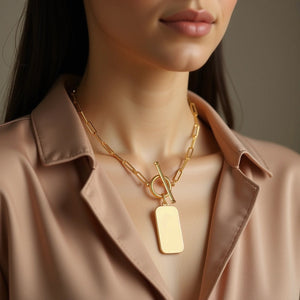 A bright rounded rectangle pendant is suspended from paperclip chain to create this elegant 14k yellow gold necklace. Necklace is 18 inches long and closes with a front toggle clasp.