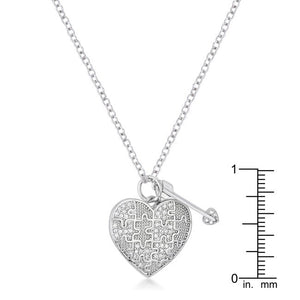 This lovely necklace is rhodium plated and thats the metal that gives white gold its shine. Thats not the only reason this beauty shines though. The playful design places an arrow charm next to the heart and the heart has a jigsaw puzzle design! Cubic zirconia adds sparkle and not only are you sure to be noticed but someone is going to want to unlock the puzzle of your heart when they see you wearing this.