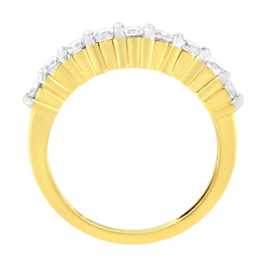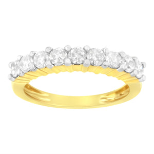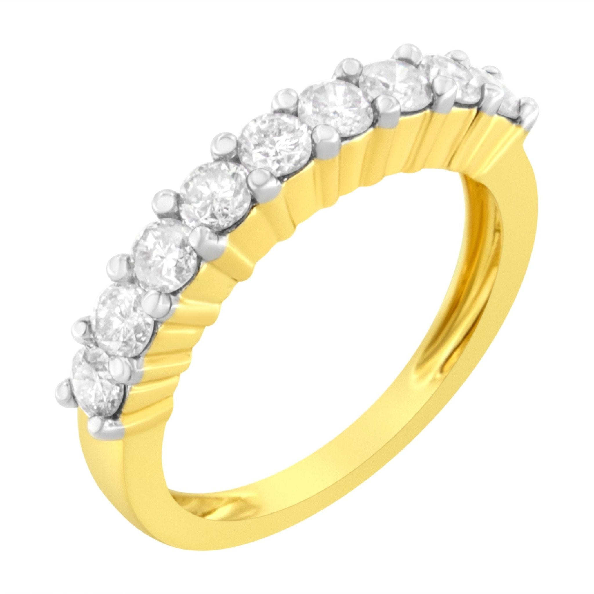 This classic and elegant 10k yellow gold band ring boasts 1 carat of beautiful, natural diamonds. Nine round-cut diamonds embellished in a prong setting sit on top of this glimmering yellow gold band. This is a timeless piece that you will want to add to your jewelry. Comes with an igi certificate.