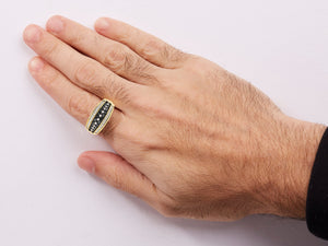 Indulge in luxury with our stunning Men's Black and White Diamond Band Ring. This remarkable piece is crafted from 10K Yellow Gold , creating an intricate and stylish design that exudes sophistication. With 66 round, natural diamonds totaling 1.5 carats, the ring boasts a brilliant contrast of color treated black and I-J diamonds, set in a secure prong setting. The I2-I3 clarity of the diamonds further adds to the unique and captivating look of the ring. Perfect for any fashion-forward man who wants to make a bold statement, this ring is available in a size 10. Don't miss out on the chance to own this magnificent piece of jewelry that is sure to turn heads and make you stand out from the crowd!
