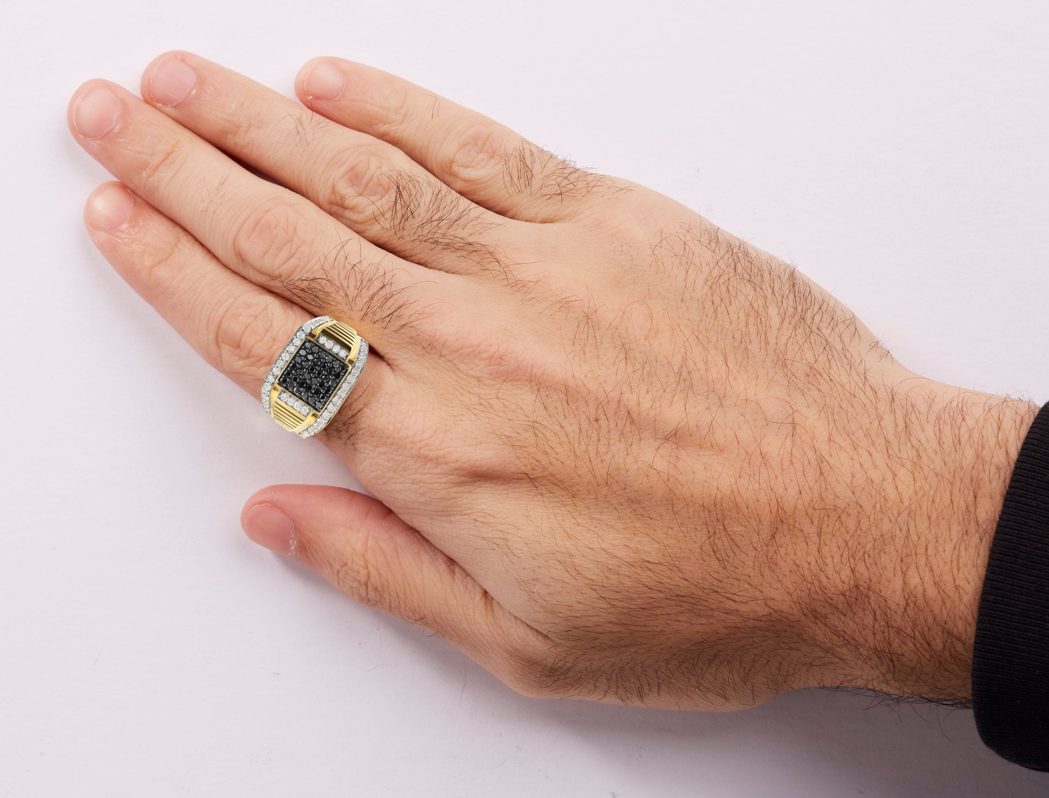 Men's 10K Yellow Gold 1 1/2 Cttw White and Black Treated Diamond Cluster Ring (Black / I-J Color, I2-I3 Clarity) - Size 10