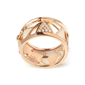 Indulge in the elegance of the 14K Rose Gold Diamond and Pink Tourmaline Cigar Band Ring, where modern design meets classic allure. With an opulent wide band of rose gold, highlighted by 1/3 Cttw of diamonds with a shimmering G-H color and SI1-SI2 clarity, this ring casts a spell of luxury on every gesture. At the heart of the piece, five lab-created pink tourmalines, splendid in their vivid hues enhanced by careful color treatment, dazzle amidst the geometric splendor of white enamel cutouts. Each 5x5 mm tourmaline is a masterpiece of round cut precision, reflecting a passion for both beauty and craftsmanship. This exquisite creation is not just a ring; it's a testament to sophisticated taste and a beacon of personal expression.