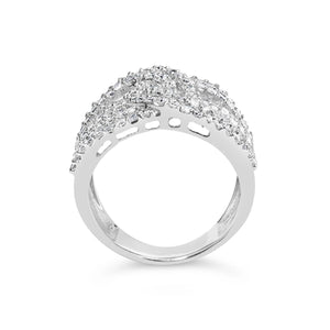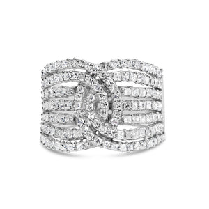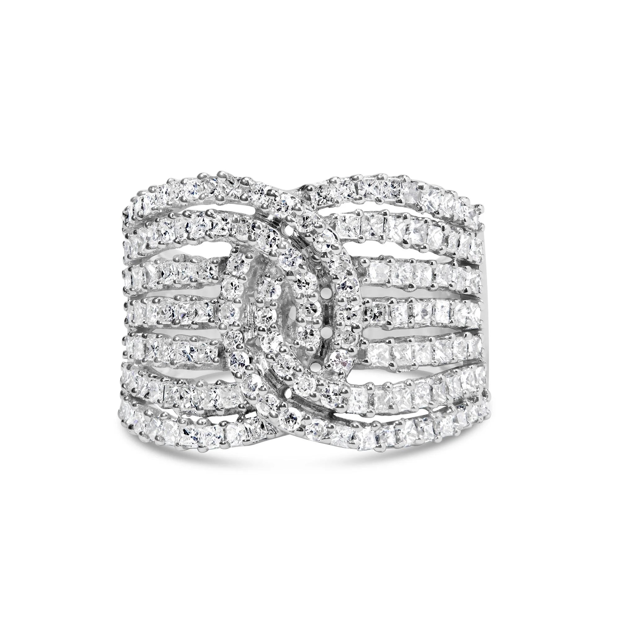 Unveil the sheer brilliance and artistry of an ensemble that entwines love and luxury, expertly crafted from 10K white gold and rhodium-plated to enhance its celestial sheen. This awe-inspiring band ring celebrates a total of 1 3/4 carats of natural diamonds, meticulously arranged in an emotive display of over 134 princess and round cuts. The grandeur of this ring extends with its eminent clarity of SI1 to SI2 and a delightful H-I color grade that captures light rapturously, radiating a resplendent sparkle from every angle. Measuring an impressive 12 mm in width and 16 mm in length, the seven-row interlacing design symbolizes the interconnection of shared paths, a perfect metaphor for life's intertwined journeys. Radiate sophistication and cherish this emblem of eternal elegance, designed for those who appreciate an extraordinary commitment to craftsmanship and timeless design.
