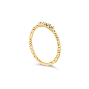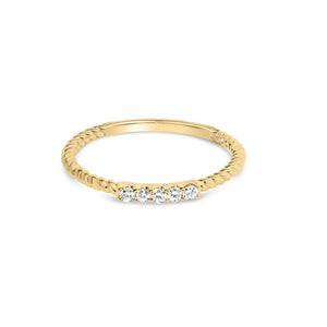 Embrace timeless elegance with this exquisite 10K yellow gold band, where five natural diamonds, summing up to 1/10 carat, glisten in harmonious alignment. Each gem, secured by prong setting to maximize their brilliance, radiates a pristine I-J color and an I2-I3 clarity, illuminating with every gesture. The band itself presents a masterful braided shank design, weaving a tapestry of rich, golden textures that symbolize the intertwining of lives and enduring love. Crafted to captivate, this ring not only ornaments your hand but also encapsulates a story of craftsmanship and enduring allure, making it an ideal symbol for celebrating life's special moments.