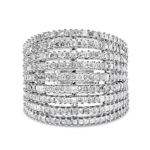 Immerse yourself in the opulence of this breathtaking 14K white gold cocktail band ring, accentuated with rhodium plating for an unparalleled mirror-like finish. Over 240 princess cut natural diamonds, totalling an impressive 3.0 carats, dazzle in a lavish arrangement of nine rows. Each diamond is meticulously set in shared prongs, creating a continuous river of incandescent light that showcases the stones' captivating H-I color and SI1-SI2 clarity. This exquisite piece of craftsmanship not only stands out for its sophisticated wide band and intricate detailing but also resonates as a symbol of luxury and grandeur, perfect for making a bold, elegant statement at any significant social gathering or exclusive event.