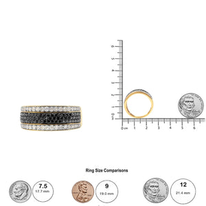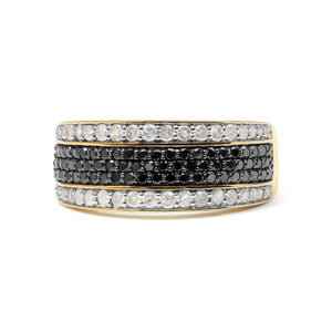Imbued with masculine elegance, this striking ring is a symphony of precision and style, crafted in luxurious 10K yellow gold. At its heart lies a daring cluster of 1 1/4 carats of natural, earth-mined diamonds, with boldly contrasting hues of deep black and pristine white. The diamonds, treated to enhance their intense color and possessing a clarity of I2-I3 and a color grade of I-J, catch the light with every movement, encapsulating a dance of shadows and brilliance. With its rows of diamonds set in a polished gold band, this ring exudes a modern aesthetic that speaks to those with a keen eye for contemporary craftsmanship and allure. Distinguished yet bold, it is a fitting accessory for the modern man who appreciates luxury woven with the unique charisma of black and white diamonds.