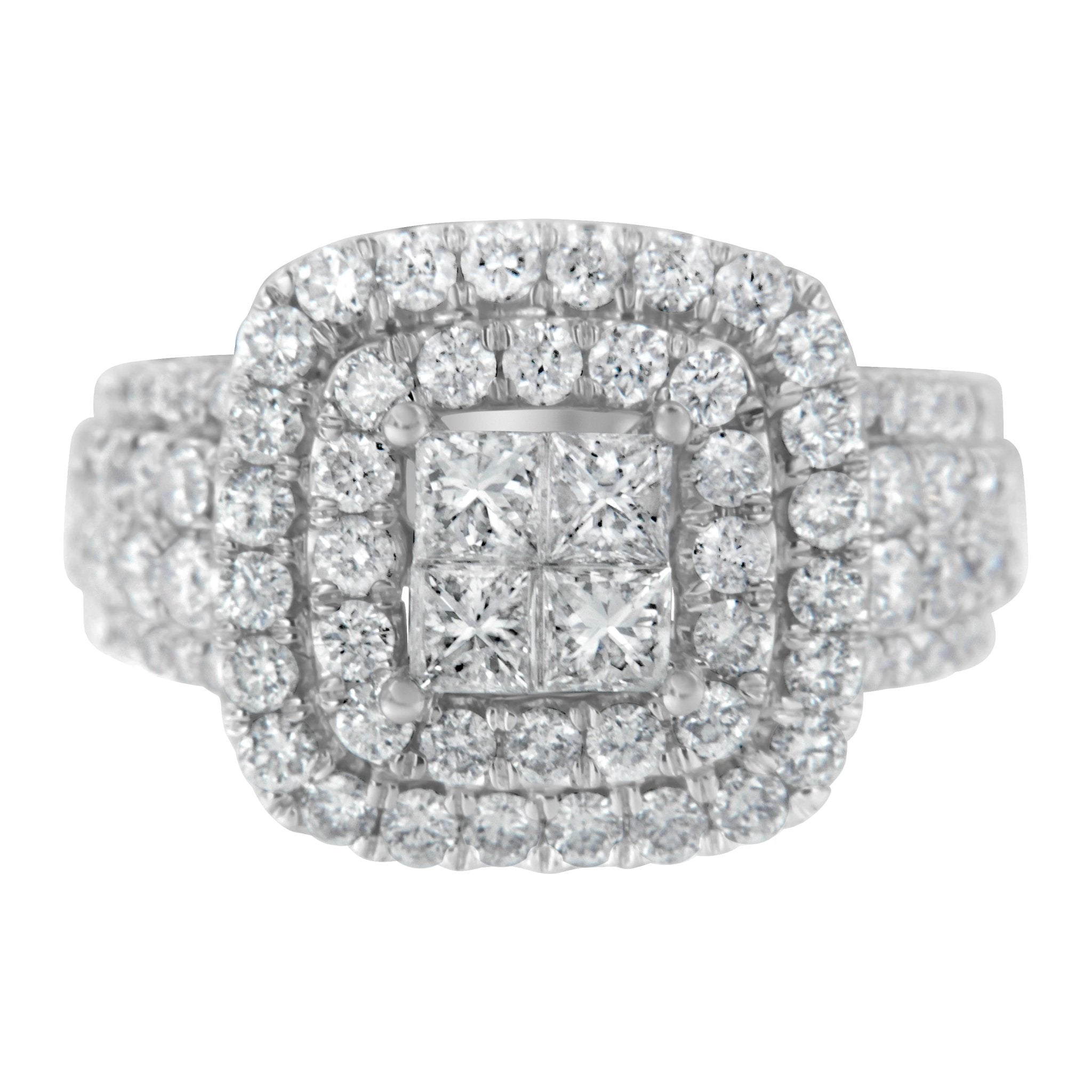 A diamond cocktail ring that sparkles with a central square cluster of princess cut diamonds surrounded by a double halo of round diamonds. The wide band is crafted in 14 karat white gold and has four rows of round diamonds. It has a total diamonds weight of 2 1/4 carats.