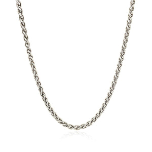 This rhodium-plated wheat chain comes in sterling silver and has a width of 2.6 millimeters.