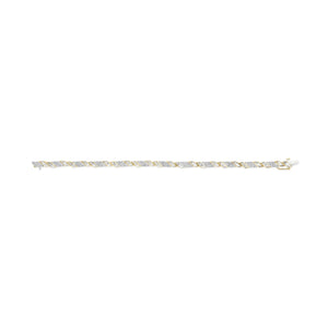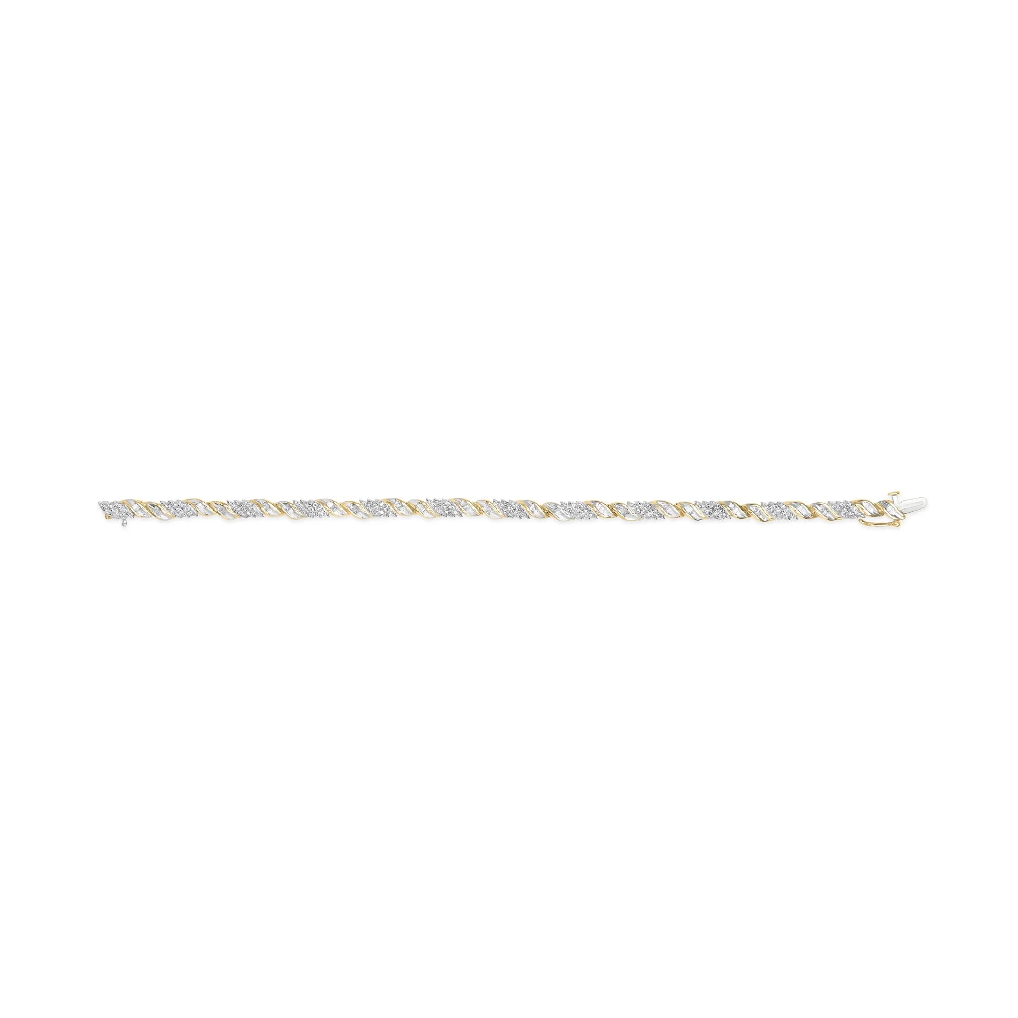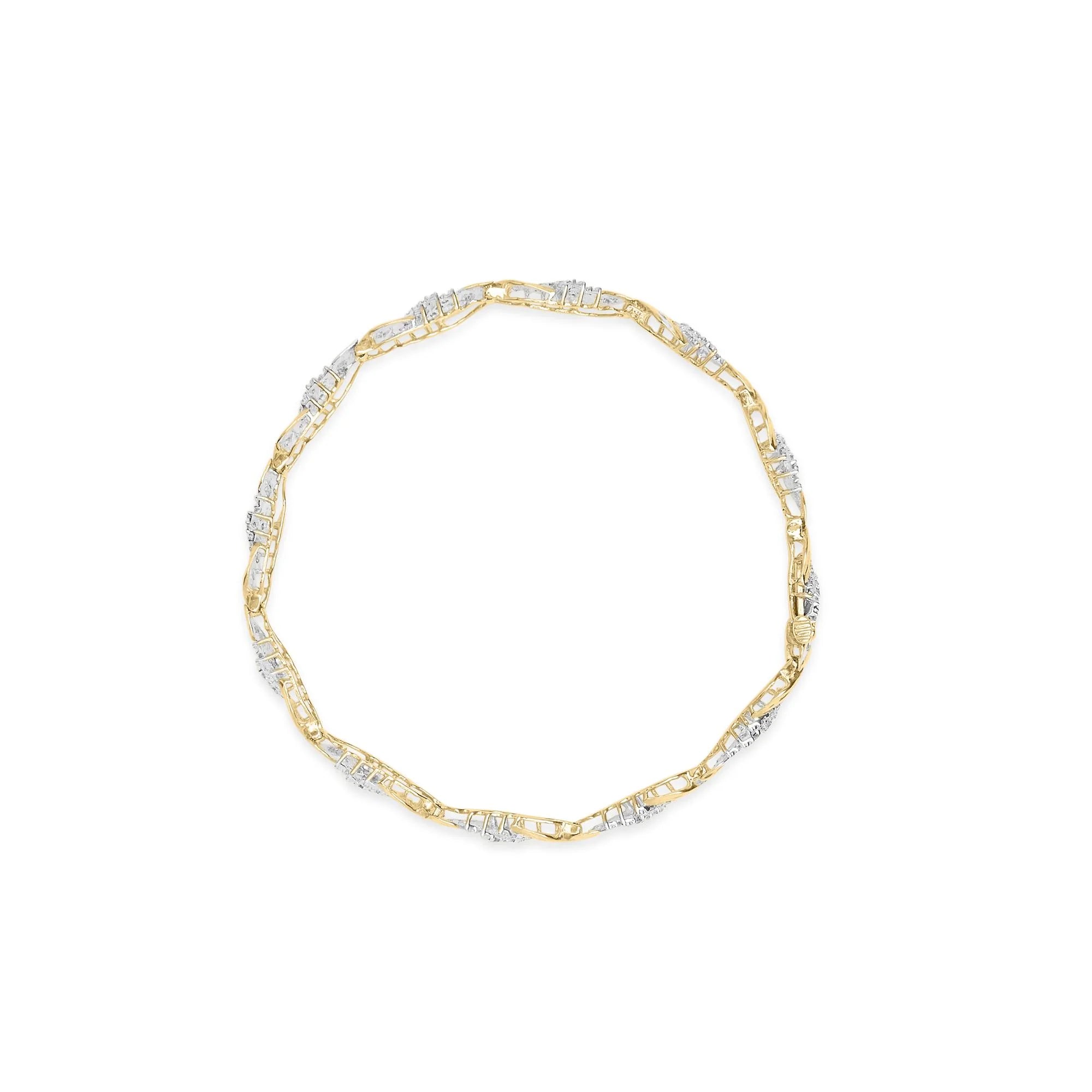 An embodiment of elegance and sophistication, this exquisite bracelet, crafted from lustrous 10K yellow gold, gracefully contours around the wrist in a captivating wave design. Enhanced by an intricate arrangement of earth-mined diamonds, its sparkle is composed of both round and channel-set baguette stones, totaling 1.00 carat. These natural gems gleam with a subtle warmth, bearing a J-K color and boasting an SI1-SI2 clarity that reflects light magnificently. Secured with a robust box clasp complemented by a latch designed for ease and safety, this piece measures 7 inches, ideally fitting the contours of your wrist. Its timeless appeal not only accentuates personal style but also celebrates the profound moments of life.