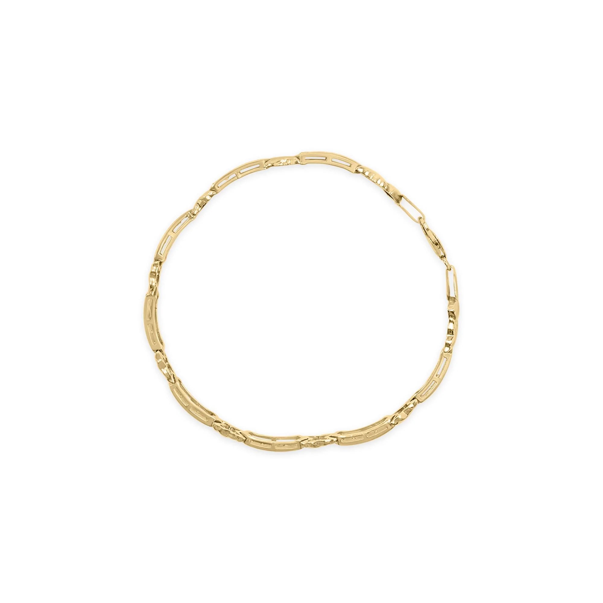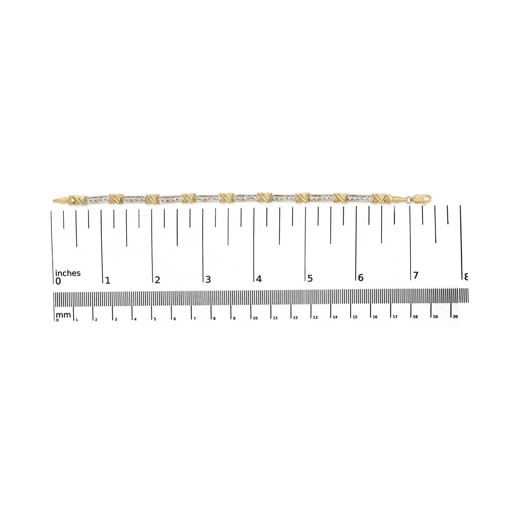 Immerse yourself in the elegance of the 10K Yellow Gold Diamond X-Link Bracelet, where sophistication meets contemporary charm. Each link, crafted with precision in radiant 10K yellow gold, forms a mesmerizing 'X' that symbolizes connection and unity. Embedded in each juncture are naturally sourced diamonds, glimmering with an I-J color and I1-I2 clarity, prong-set under a rhodium plating that enhances their luminous white allure. This exquisite piece is designed to grace your wrist up to 7 inches and ensures a secure fit with a robust lobster claw clasp, combining ease with opulence. Whether it's an evening draped in finery or your daily wardrobe uplift, this bracelet is your promise of lasting brilliance and an enchanting presence.
