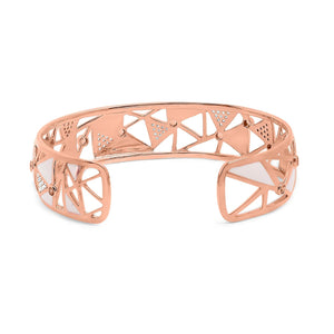 Wrapped with the opulence of 14K rose gold and studded with luminous white diamonds totaling 5/8 carats with a clarity of SI1-SI2 and G-H color, this 7-inch open cuff bangle is a masterpiece of design and distinction. The bangle dazzles with its unique pattern of elegantly open spaces and refined sections of pristine white enamel, creating a magnificent canvas that captures the eye and the imagination. Adorned with four radiant, lab-created pink tourmalines, color-treated to enhance their vivid hues, this accessory promises not only to adorn the wrist but also to captivate the beholder's heart. Each gemstone and diamond set upon this exquisite piece speaks of geometric sophistication and the promise of luxury, making it an essential treasure for those with a penchant for graceful style and timeless elegance.