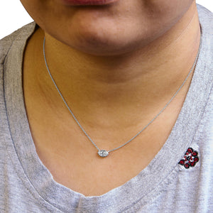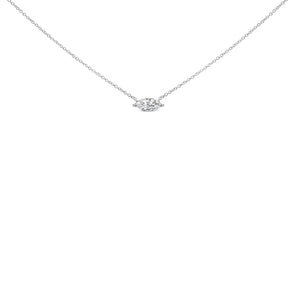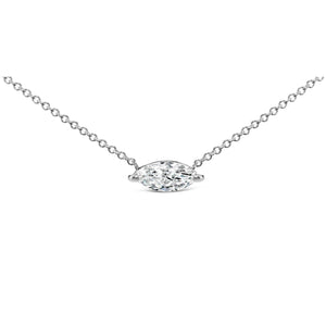 Experience the refined elegance of this 14K white gold pendant necklace, where modernity and luxury harmonize to create a timeless piece of jewelry. At its heart lies a 1/2 carat marquise lab-grown diamond, celebrated for its ethereal F-G color and pristine VS2-SI1 clarity. Artfully set in a unique east-west orientation, the diamond radiates with an unbridled brilliance, its elongated silhouette catching the light with every movement. The minimalist setting emphasizes the diamond's natural luminosity, ensuring it remains the unrivaled centerpiece. Suspended on a delicate 18-inch chain, this necklace promises a graceful drape that complements any neckline. Crafted meticulously from enchanting white gold, this piece not only embodies the pinnacle of contemporary jewelry design but also offers a sustainable choice with its lab-grown diamond. A true symbol of sophistication, it invites the wearer to display their penchant for style that transcends time.