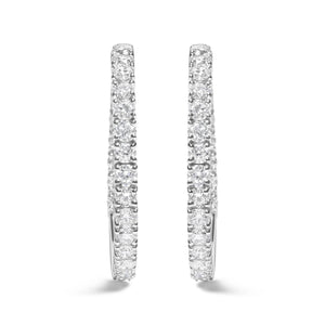 Indulge in the ultimate luxury with these magnificent 14K white gold inside out hoop earrings. Adorned with 50 shimmering, lab-grown round diamonds, these earrings boast a breathtaking 5.0 carats of fire and brilliance. The diamonds are rated F-G for color and VS1-VS2 for clarity, ensuring their sparkling beauty will last a lifetime. Each diamond is securely set in a prong setting, maximizing their sparkle. The earrings are designed with a snap post for ease of wear and maximum comfort. These lab-grown diamond inside out hoop earrings are the perfect addition to any jewelry collection, adding a touch of glamour to any outfit. Whether you're looking to make a statement or simply treat yourself, these earrings are the epitome of style and sophistication.