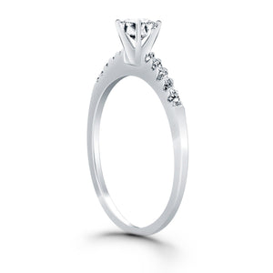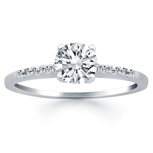 This slender semi-mount engagement ring can accommodate a wide range of center stone sizes and shapes. The ring band has a slightly tapered square profile and set with shared micro prong set diamonds that enliven the center setting. Understated and elegant, this ring draws on the classic solitaire design and takes it up a notch with glittering diamonds across the front of the slim band. Center stone and setting not included.