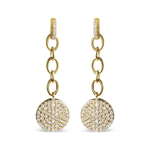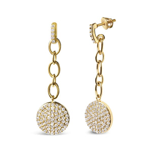 Step into a world of elegance and luxury with these 14K yellow gold diamond dangle chain earrings. Adorned with 132 round-cut, natural diamonds, these earrings boast a total weight of 1.00 cttw and a stunning I-J color and I1-I2 clarity. The diamonds are prong-set in the earrings, creating a stunning shimmer that will light up any room. The dangle chain design adds a touch of sophistication to any outfit, while the push back earring findings ensure a secure and comfortable fit. These earrings are the perfect addition to any jewelry collection and make a statement of both style and class. Whether you are looking to add a touch of glamour to a special occasion or to simply treat yourself, these diamond dangle chain earrings are the perfect choice. They are a perfect gift for any woman who loves the sparkle and shine of diamonds, and will quickly become a cherished addition to any jewelry collection. Earrings dangle approx 1 3/4 inches off the ear.