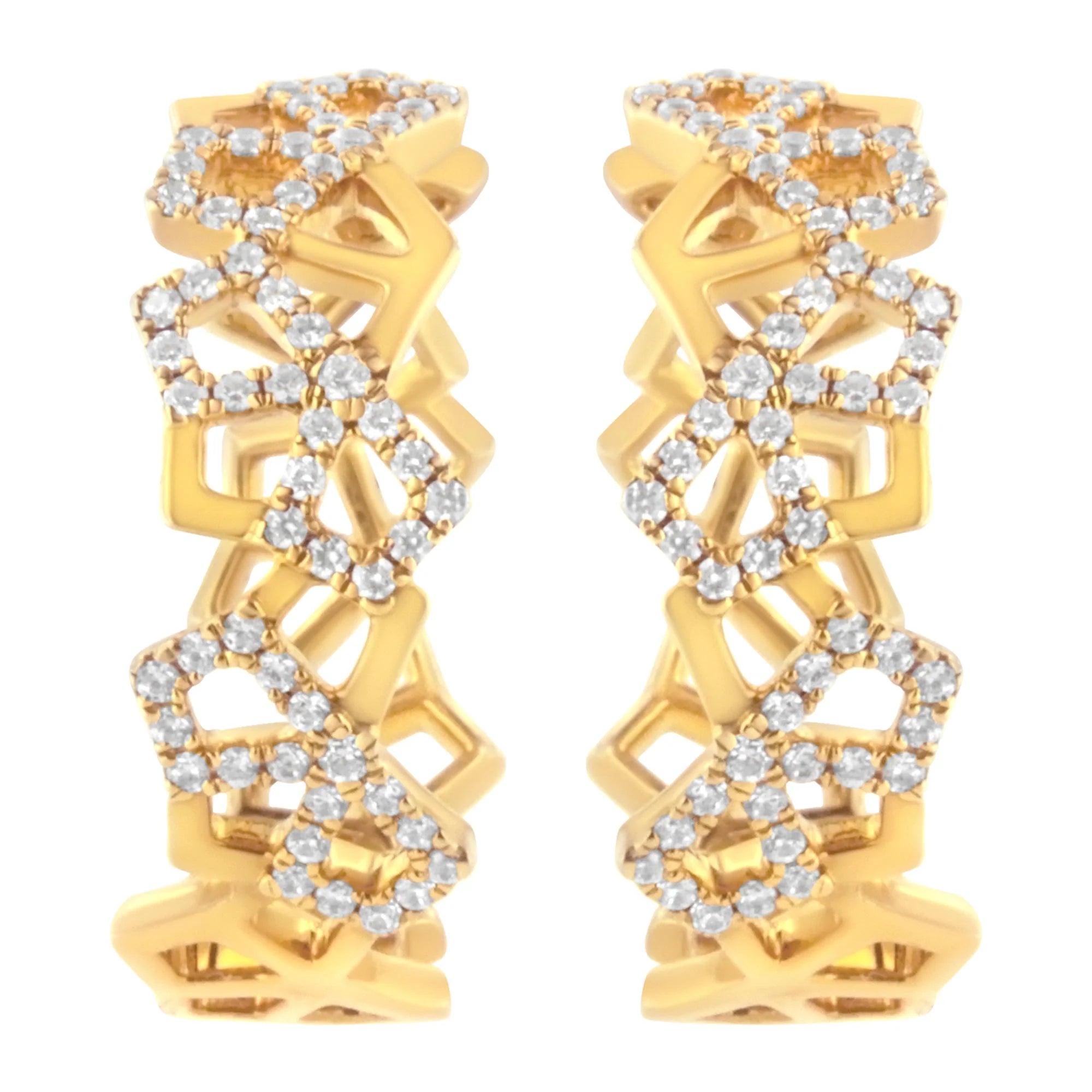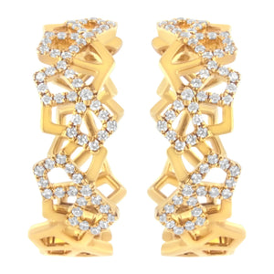 Indulge in the opulence of these 14K yellow gold hoop earrings, where luxury meets geometric elegance. Each piece parades a mesmerizing honeycomb pattern, meticulously set with natural diamonds that dazzle with G-H color and SI1-SI2 clarity, ensuring a brilliant display of sparkle. The distinction of the crisp, white spaces interspersed within the design enhances the captivating allure, making these earrings a testament to sophisticated craftsmanship. Measuring an ideal 24mm, they sit gracefully along the contour of your ear, secured with a practical latch back clasp. These hoops are not just accessories; they are a celebration of style, designed to catch the light and admiring glances at every turn.