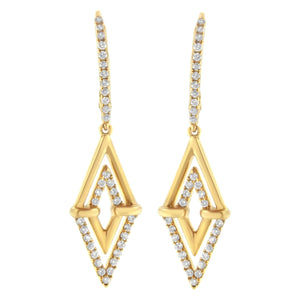 Immerse yourself in the world of sumptuous elegance with these 14K yellow gold earrings, delicately fashioned into a sophisticated double triangle drop and dangle design. Each earring showcases a stunning cascade of natural diamonds, each meticulously pave-set in a rhodium-plated backdrop that accentuates their luminous G-H color and near-flawless SI1-SI2 clarity. With a total diamond weight of 3/8 carats, these pieces glisten with an ethereal sparkle that captures the light with every movement. Measuring an entrancing 1.45 inches, they dangle with a poised grace, secured by diamond-studded lever backs that promise both comfort and allure. An embodiment of luxury, these earrings not only adorn your ears but also elevate any attire, making them a perfect choice for anyone looking to indulge in a touch of timeless sophistication.