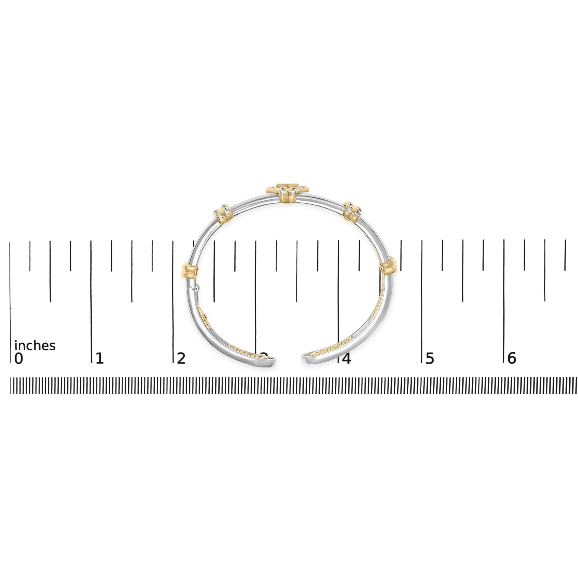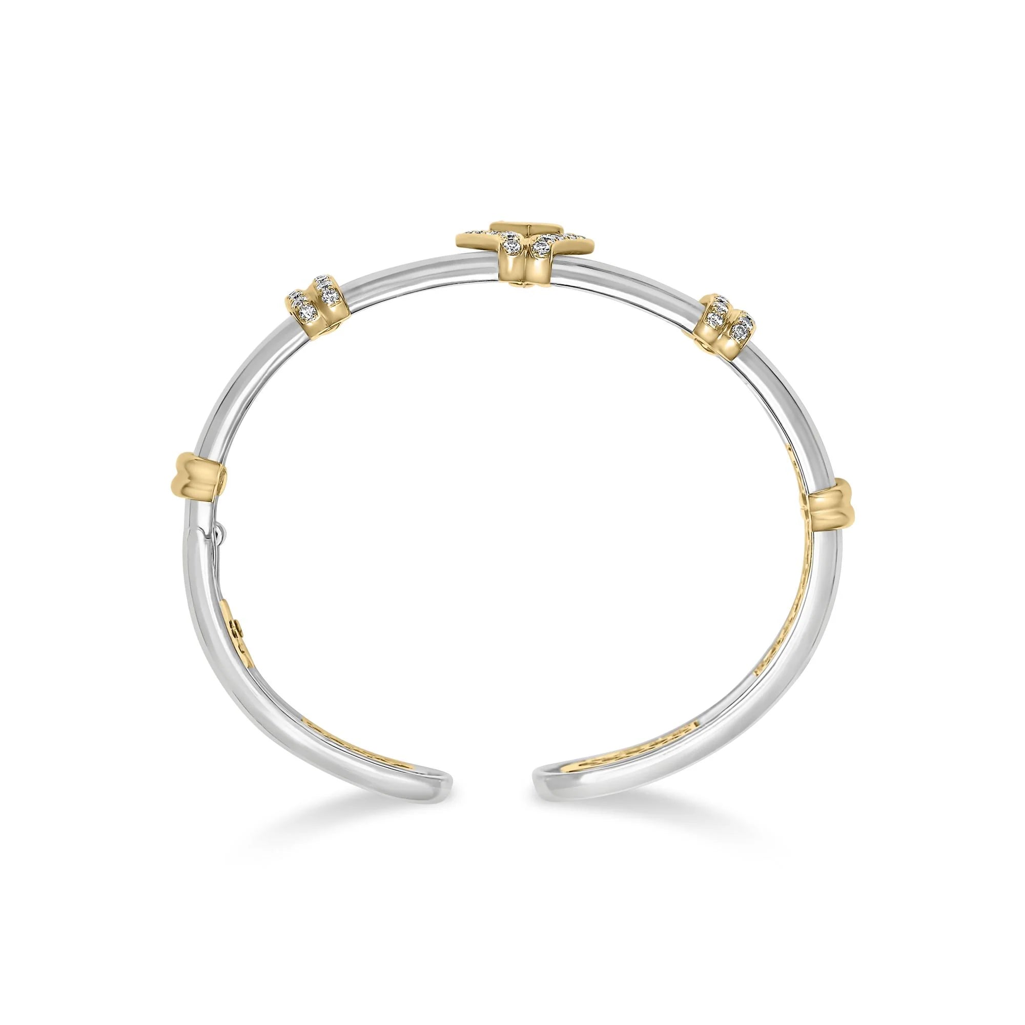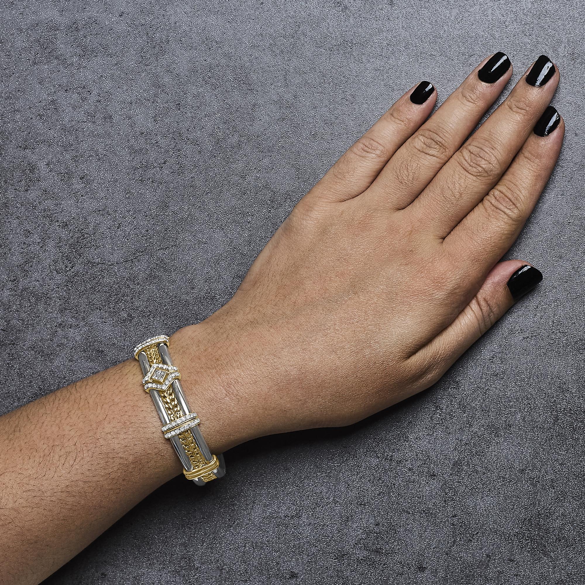 Discover elegance redefined with our exquisite 18K two-tone gold diamond cuff bangle, designed to dazzle with its intricate braided detail and striking geometric centerpiece. Masterfully crafted from the finest 18K white and yellow gold, this bracelet blends timeless sophistication with modern allure. Adorned with a row of resplendent natural diamonds, boasting G-H color and VS1-VS2 clarity, it radiates unparalleled brilliance and clarity. Each diamond is meticulously set to highlight the unique, textured design that captivates and enchants. The innovative hinge mechanism ensures a seamless fit for wrists up to 7 inches, marrying comfort with luxe appeal. Embrace the splendor of this stunning piece, perfect for those who seek to add a touch of glamour to every gesture.