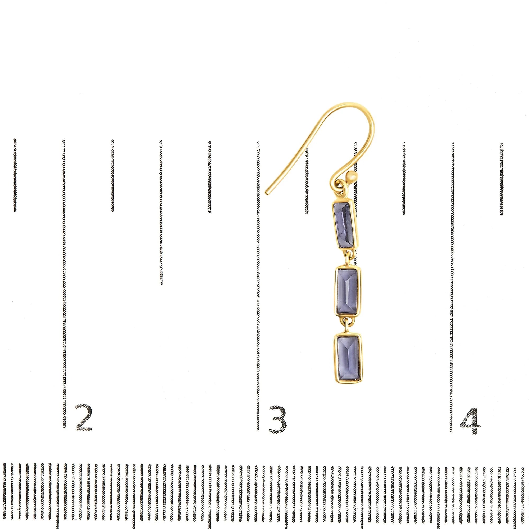 Sublime in their elegance, these dangle earrings epitomize luxurious grace, meticulously designed to sway with every subtle movement. Crafted from the finest 18K yellow gold, their 1.5-inch drop is a testament to sophisticated craftsmanship. Each earring encases three enchanting purple Iolite stones in a precise bezel setting, ensuring their deep, untainted hues catch the light with an enthralling luster. Natural and untreated, these gemstones exude purity and rarity, beautifully complementing the gleaming gold. The pairing of the rich purple baguettes with the warm gold offers an exclusive aesthetic that transcends typical jewelry, promising not just adornment but a piece of art that dances gracefully off the earlobes. Perfectly secured with fish hook findings, they assure both comfort and unrestrained elegance. Envision these as not merely earrings, but as a portal to enigmatic charm and refined taste.