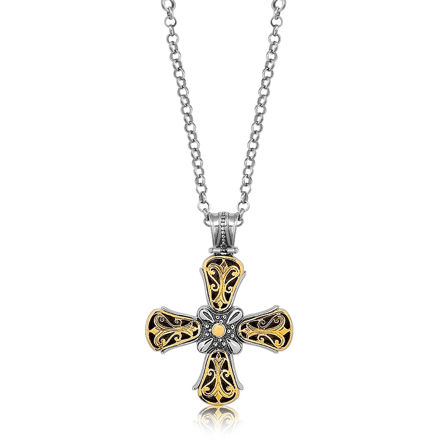18K Yellow Gold and Sterling Silver Fancy Antique Style Cross Pendant