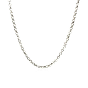 This rolo chain comes in 14k white gold and has a width of 2.3 millimeters.