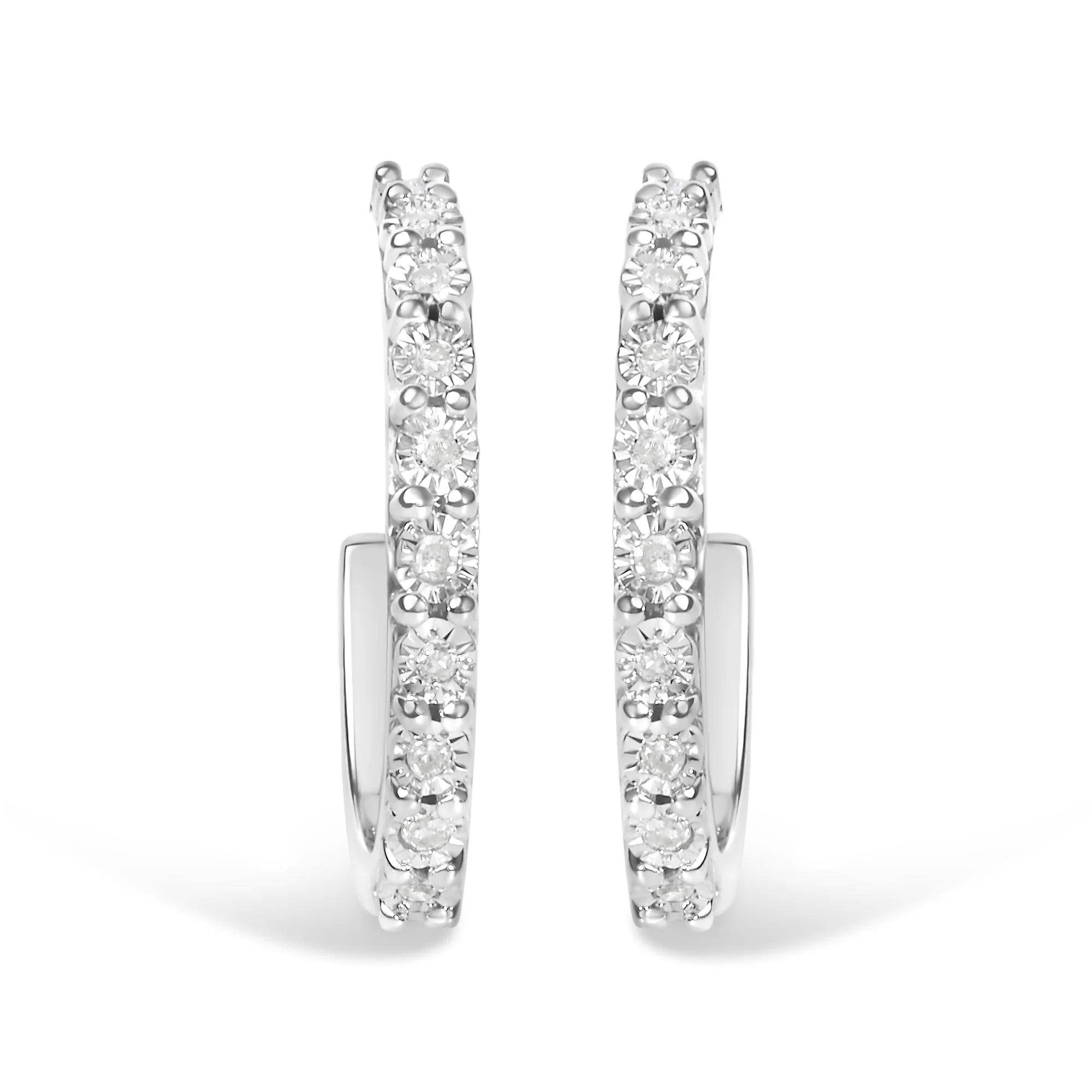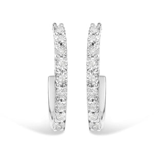 Radiate elegance and timeless sophistication with these exquisitely crafted earrings. Each pair of J-hoop stunners showcases a continuous line of naturally sourced diamonds, their I-J hues dancing with a subtle yet mesmerizing brilliance. Despite their I3 clarity, these gems deliver both an accessible price and irresistible allure. Forged from the high-quality .925 sterling silver and gracefully plated with rhodium, the earrings offer an enduring shine that merges classic charm with modern resilience. Measuring a delicate .66 inches, they dangle with effortless grace, becoming an essential accent for any attire. The push-back closure ensures a snug and comfortable fit, letting you wear them from dawn till dusk with ease. With a modest total diamond weight of 1/10 carat, these earrings strike the perfect balance between understated charm and eye-catching sparkle. Elevate your look with this chic accessory - a testament to fine craftsmanship and a beacon of refined taste.