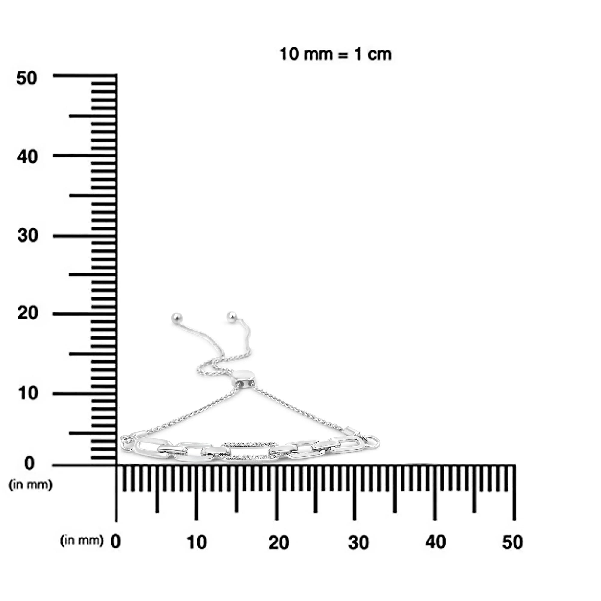 Delicately crafted from high-quality .925 sterling silver, this exquisite bracelet embodies modern sophistication intertwined with a hint of timeless charm. Its sterling brilliance, enhanced with rhodium plating, ensures a radiant glow that complegrades with the wearer's every movement. Central to its uniquely alluring design is the innovative paperclip link, embellished naturally with diamonds totaling 1/10 carats. These precious stones catch the light with their I-J color and I2-I3 clarity, infusing every gesture with a sparkle synonymous with elegance. The adjustable bolo closure, refined with dainty spherical beads, is both practical and stylish, offering a customizable fit for wrist sizes from 4 to 10 inches. This piece is not just jewelry; it's a versatile companion, perfect for upscale events or adding a touch of glamour to your everyday ensemble.