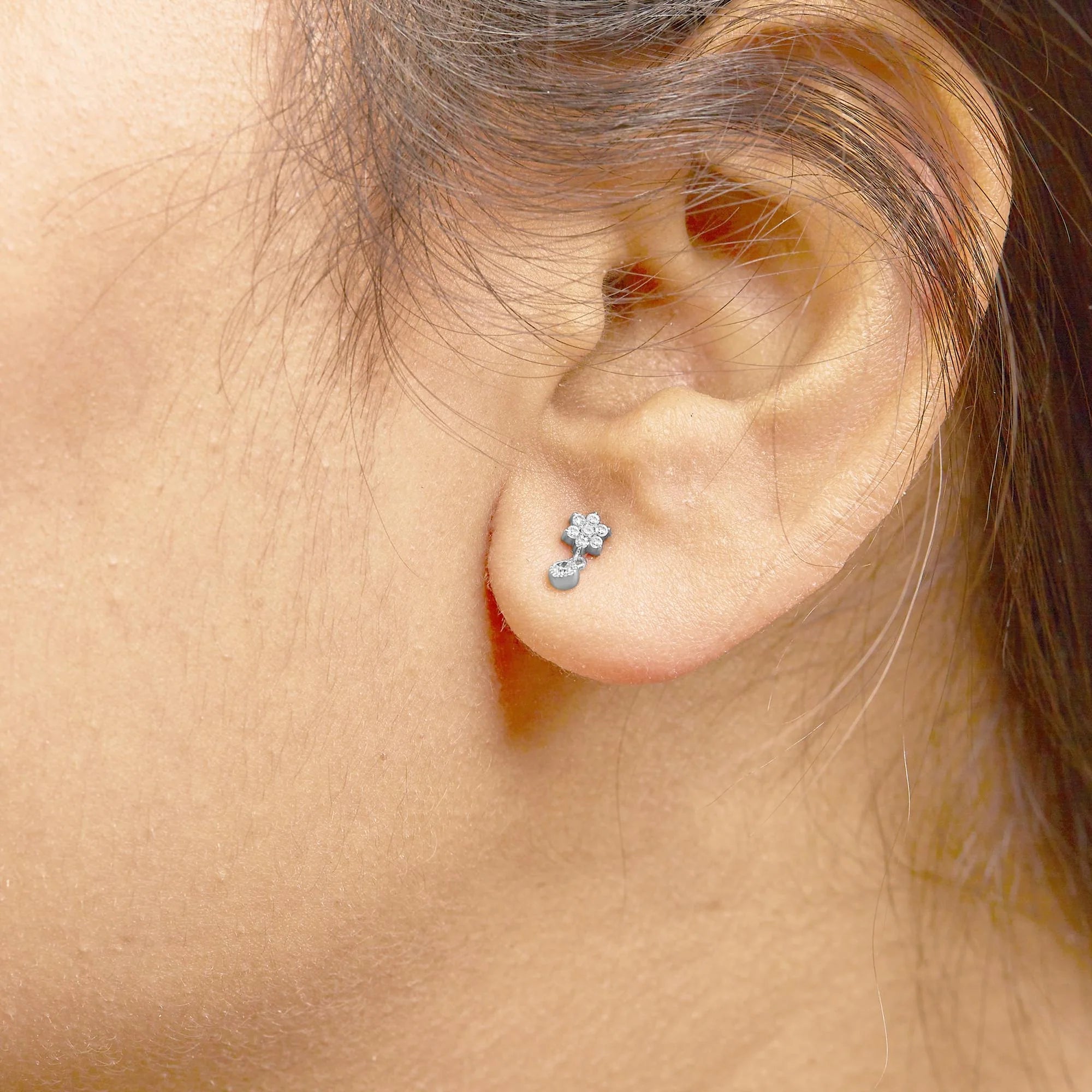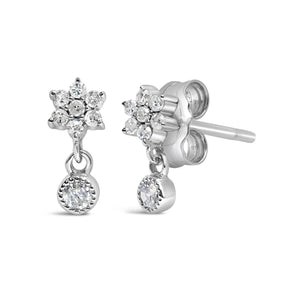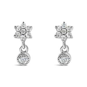 Embrace the night sky's enchantment with these exquisite sterling silver earrings, featuring a design as whimsical as a starlit evening. Each piece showcases a delicate star adorned with a cluster of natural, earth-mined diamonds, their subtle I-J color and I2-I3 clarity twinkling like distant celestial bodies. A solitary diamond, encased gracefully in a bezel drop, dangles with understated elegance, enhancing the allure and adding a dynamic element to the silhouette. Crafted from .925 sterling silver and finished with a rhodium plating, these earrings promise not only an exceptional gleam but enduring strength to withstand the tests of time. Secure push-back closures ensure they remain a comfortable yet constant reminder of the beauty above and the craftsmanship bestowed upon them.