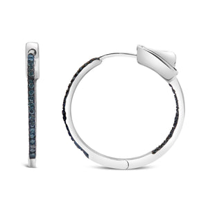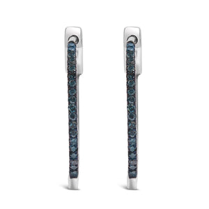 Crafted from rhodium-plated .925 sterling silver, these exquisite hoop earrings offer a slender, graceful silhouette, measuring 1mm in width and dangling a delicate 3/4 inch. Adorned with a vibrant array of blue treated diamonds, totaling 1/3 carat, these gems boast a natural origin, enhanced to achieve their captivating azure hue. The diamonds' clarity of I2-I3 sparkles with an enchanting mystery, drawing the eye and illuminating the face with every turn. Secured with a reliable hinge back mechanism, these earrings promise both comfort and security, making them a perfect choice for both everyday elegance and special occasions. Embrace the allure of these blue wonders, designed to add a splash of color and sophistication to any ensemble.