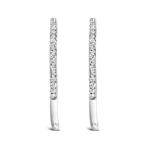 Discover the timeless elegance of our rhodium-plated .925 sterling silver hoop earrings, each gently embracing the light with 1/3 carat of natural white diamonds. Their slim 1mm profile glides gracefully around the contour, illuminated from within and out by diamonds with a clarity of I2-I3 and H-I color, crafting a celestial halo near your face. With a sophisticated 3/4 inch dangle, these earrings promise a subtle yet striking enhancement to both day and evening attire. The secure hinge back design guarantees comfort and peace of mind, making these exquisite pieces not only a display of craftsmanship but also a symbol of enduring style and luxury. Elevate your jewelry collection with this sparkling embrace, a testament to refined beauty and classic sophistication.