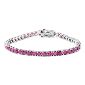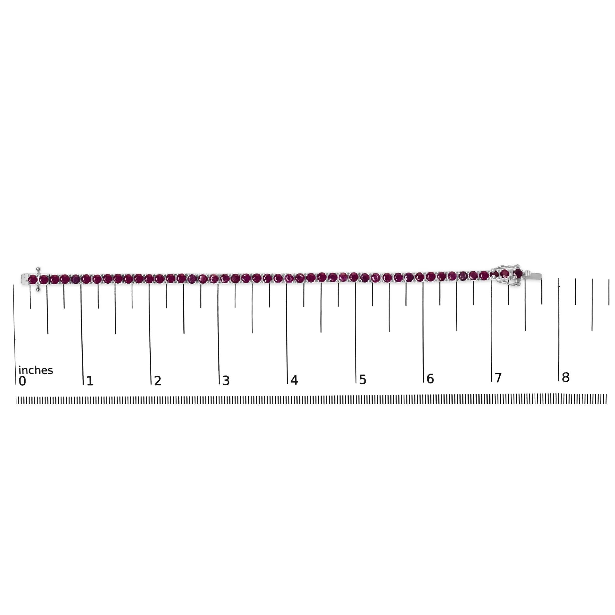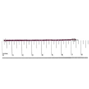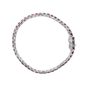 Drape your wrist in a ribbon of sumptuous pink with this exquisite 11 1/2 carat tennis bracelet, meticulously crafted from rhodium-plated .925 sterling silver. Each lab-created ruby, vivid in its lush dark pink hue, has undergone careful color treatment to achieve its mesmerizing depth, mirroring the endless possibilities of love and elegance. These gemstones, each measuring a perfect 3.5x3.5mm, are set delicately in a seamless line, capturing light and admiration in equal measure. Measuring 7.25 inches, it clasps securely with a sophisticated box clasp and safety latch, ensuring not only comfort but also peace of mind as you adorn this timeless piece. Perfect for those who cherish luxury and durability, it shines as a testament to passion and precision in modern jewelry design.