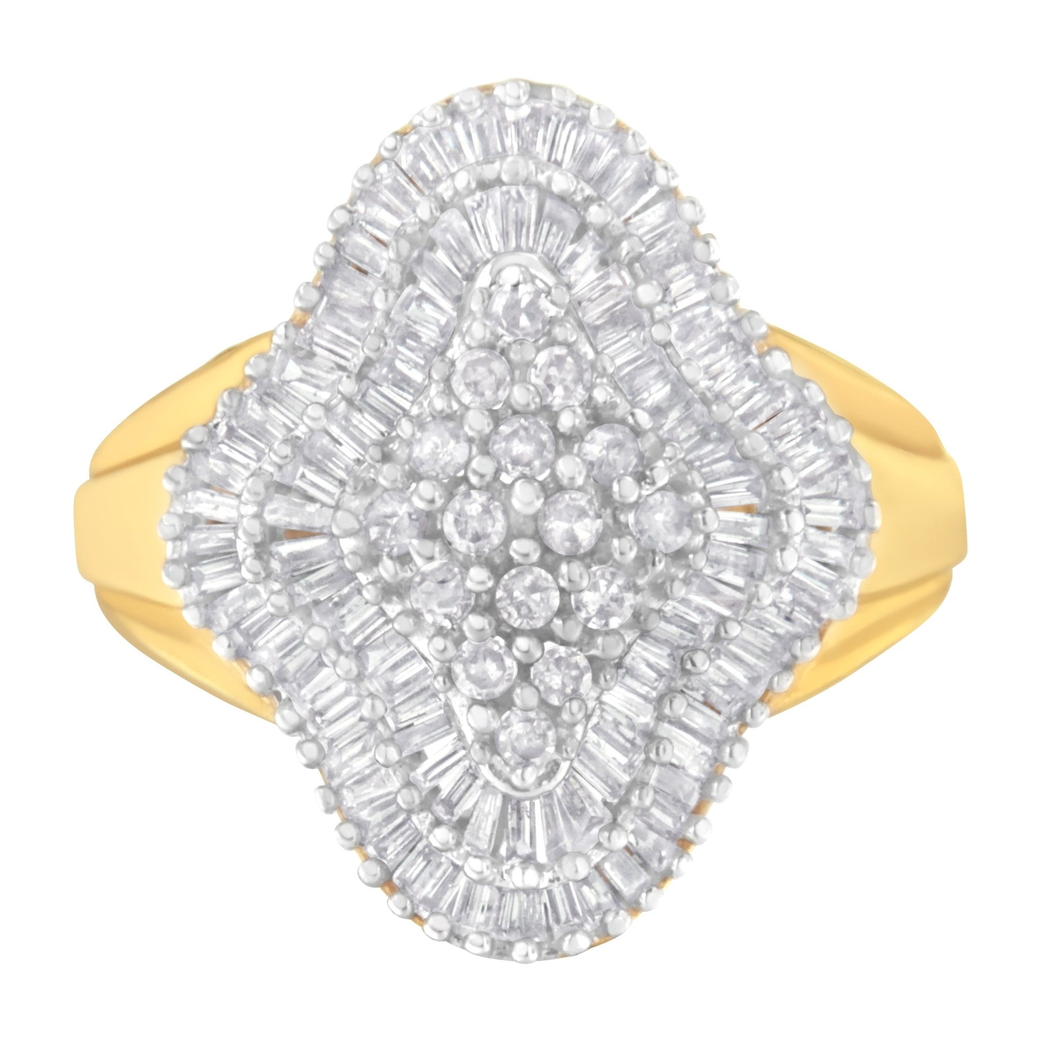 Bold and unique, this 10k yellow gold ring is a real masterpiece. Prong set round cut diamonds create a center cluster. A double row of shimmering baguette cut diamonds surround the central cluster. 1ct TDW of diamonds make up this exquisite ring design.
