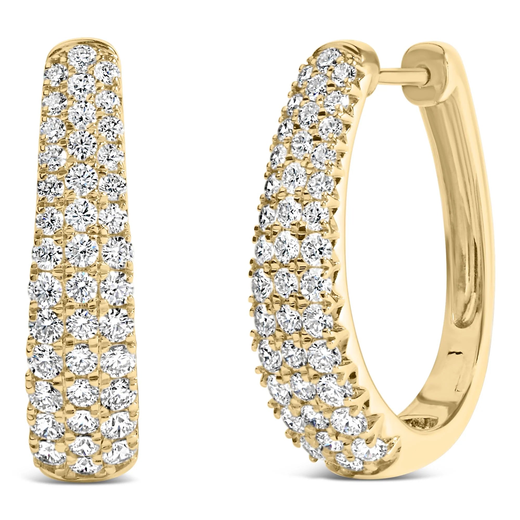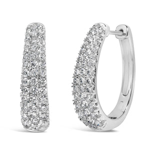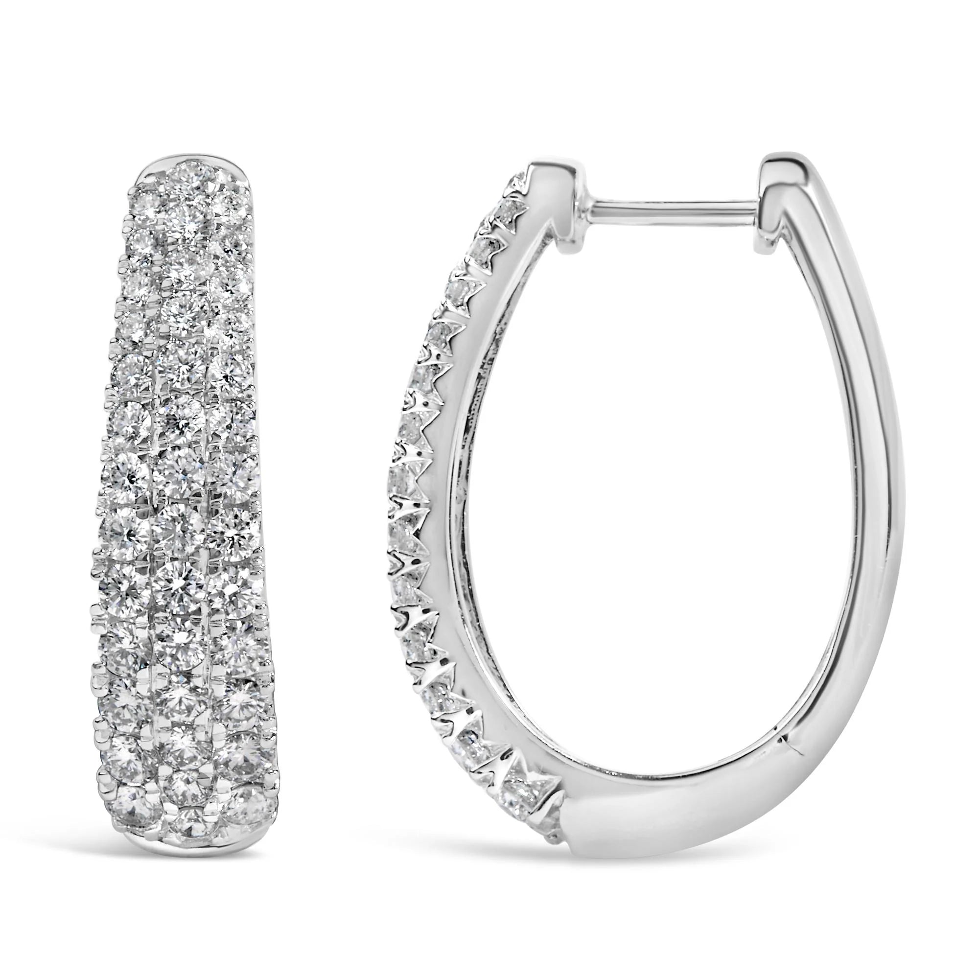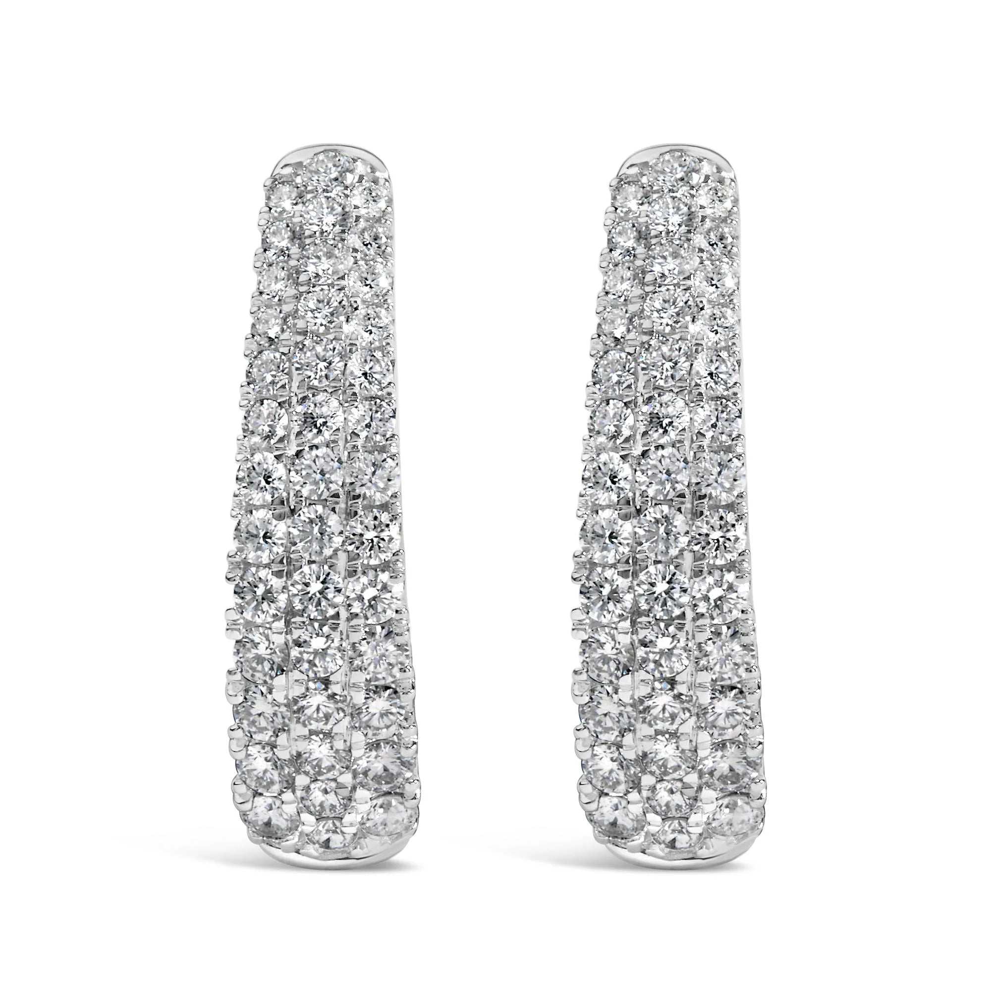 Discover opulence that dangles delicately with these 14K white gold hoop earrings, where elegance meets a spark of brilliance. These exquisite jewels, gleaming with a rhodium finish for that extra touch of luster, introduce a mesmerizing pave of natural diamonds, each meticulously set to create a seamless ribbon of light. With an impressive 1 3/4 carat total weight, the stones are carefully chosen for their G-H color and VS2-SI1 clarity, promising a scintillating dance of light with every turn. The design tapers gracefully, broadening to a chic 6mm at the apex, ensuring visibility and allure. Crafted for comfort and security, the snap post mechanism fits snugly, making these earrings not only a statement of luxury but also a pleasure to wear. Perfect for elevating evening wear or adding a sparkle to a day look, they are a timeless addition to any jewelry collection.