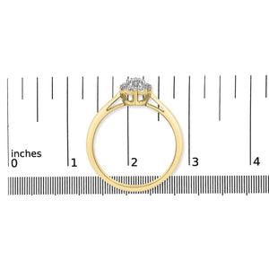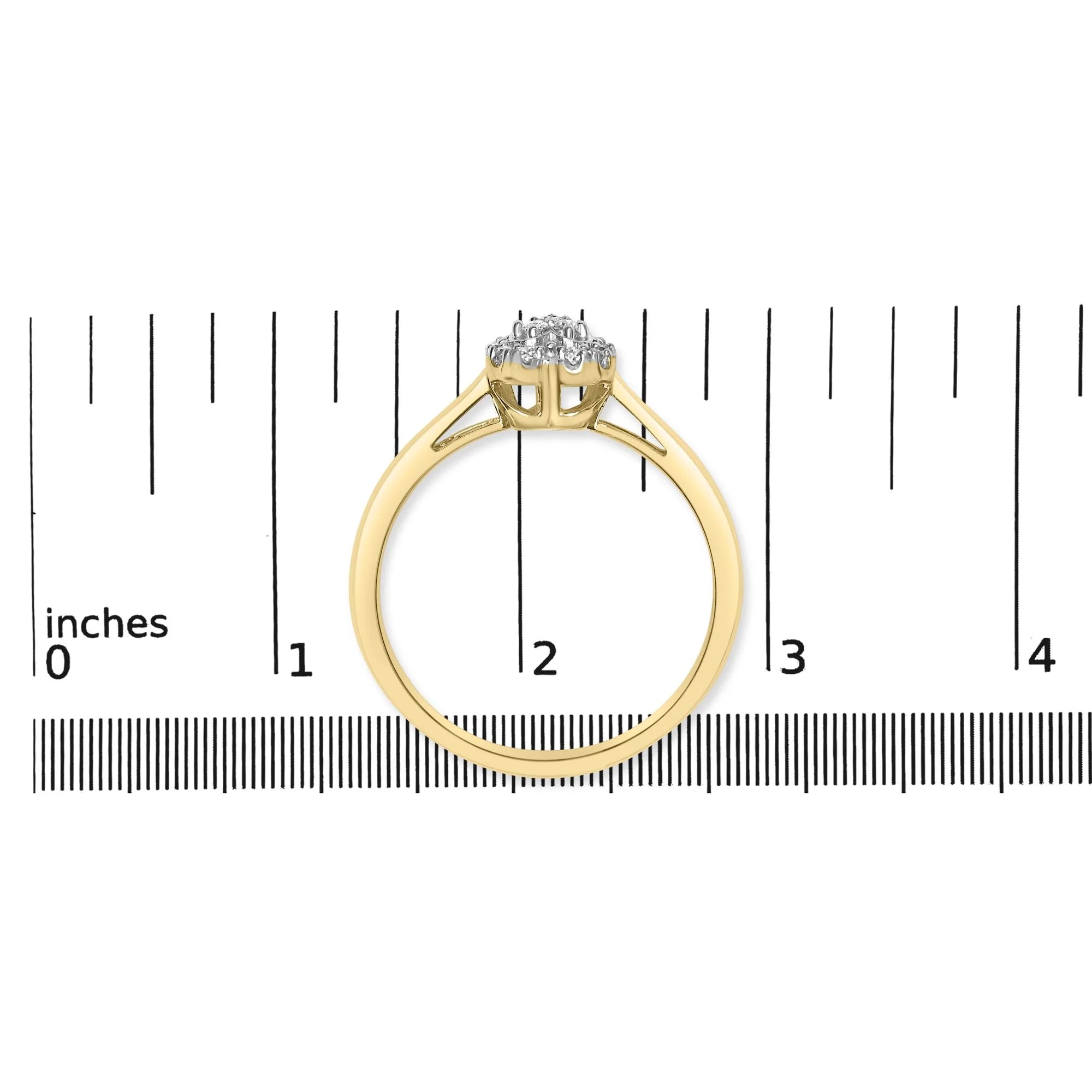 This enchanting engagement ring intertwines classic charm with the sparkle of natural love, destined to capture hearts. Crafted in smooth, 14K yellow gold-plated .925 sterling silver, this piece features a romantically heart-shaped centerpiece. Here, the purity of white silver forms a stage for meticulously arranged, round-cut diamonds totaling 1/10 carat. Each diamond, with an I-J color and I3 clarity, is prong-set to dance under the light's touch. The radiant cluster pattern of these natural diamonds echoes an everlasting commitment, as timeless as it is luminous. Perfect for proclaiming a life together, the ring's dual-tone elegance and delightful sparkle make a profound statement of love and dedication.