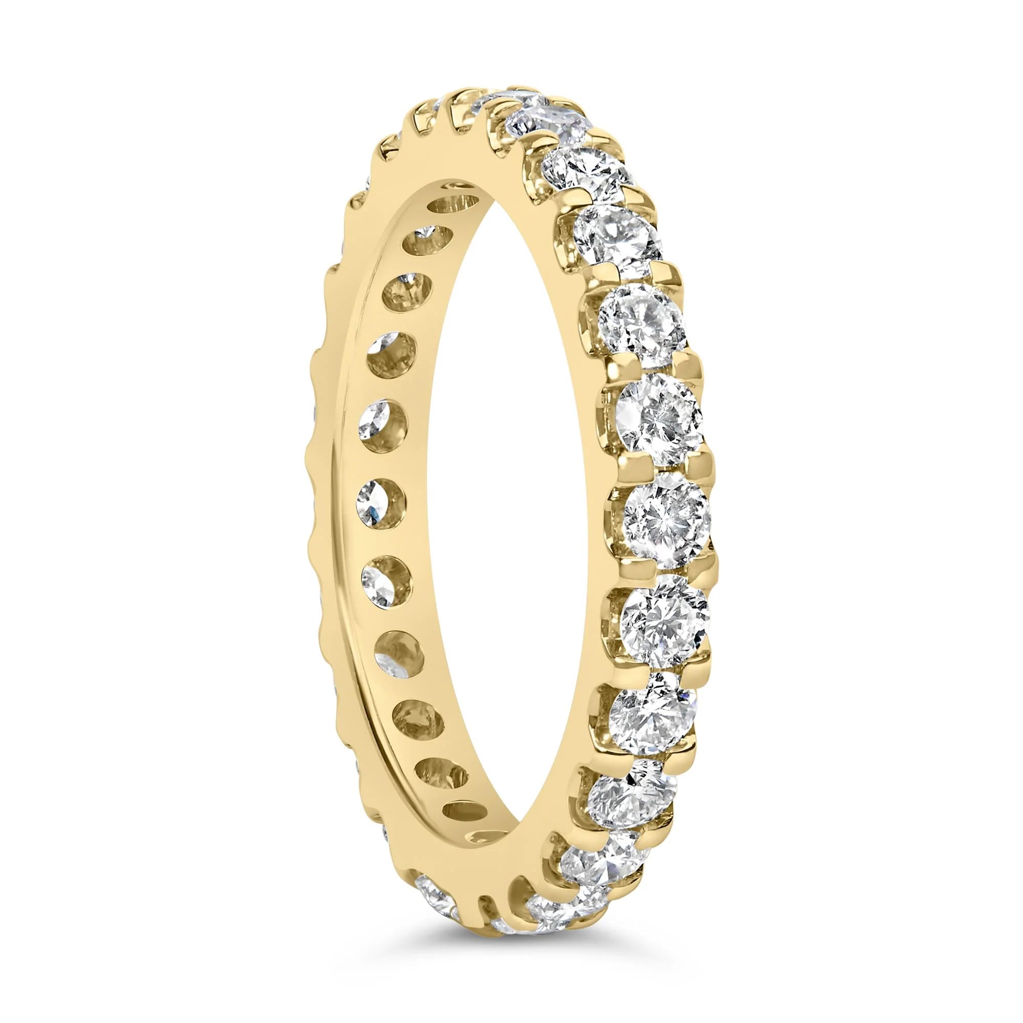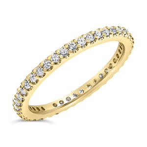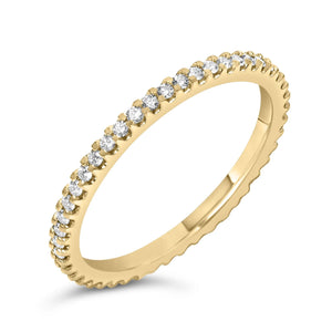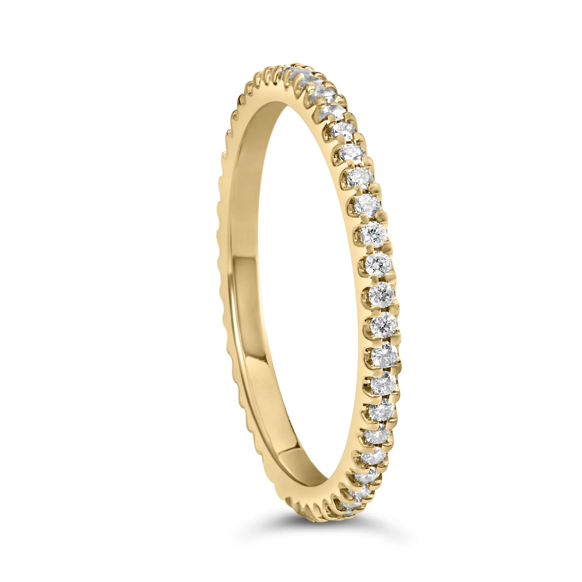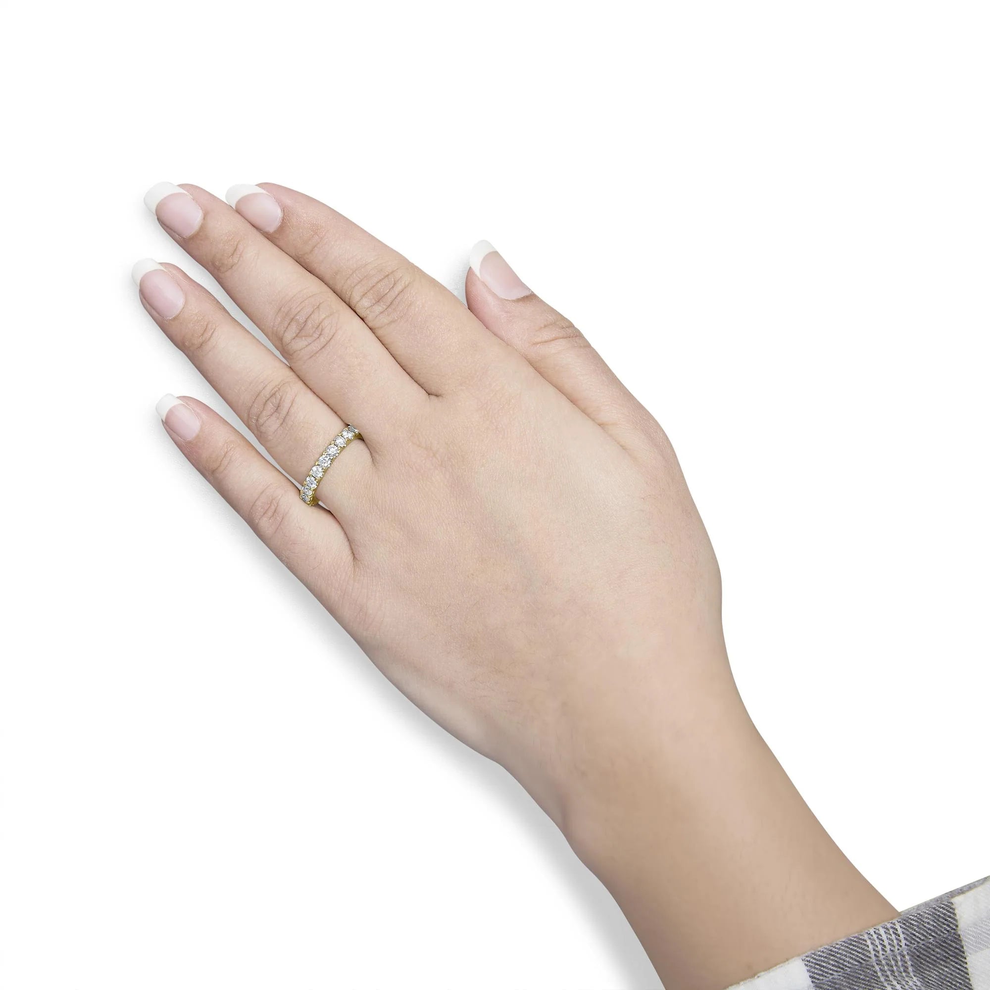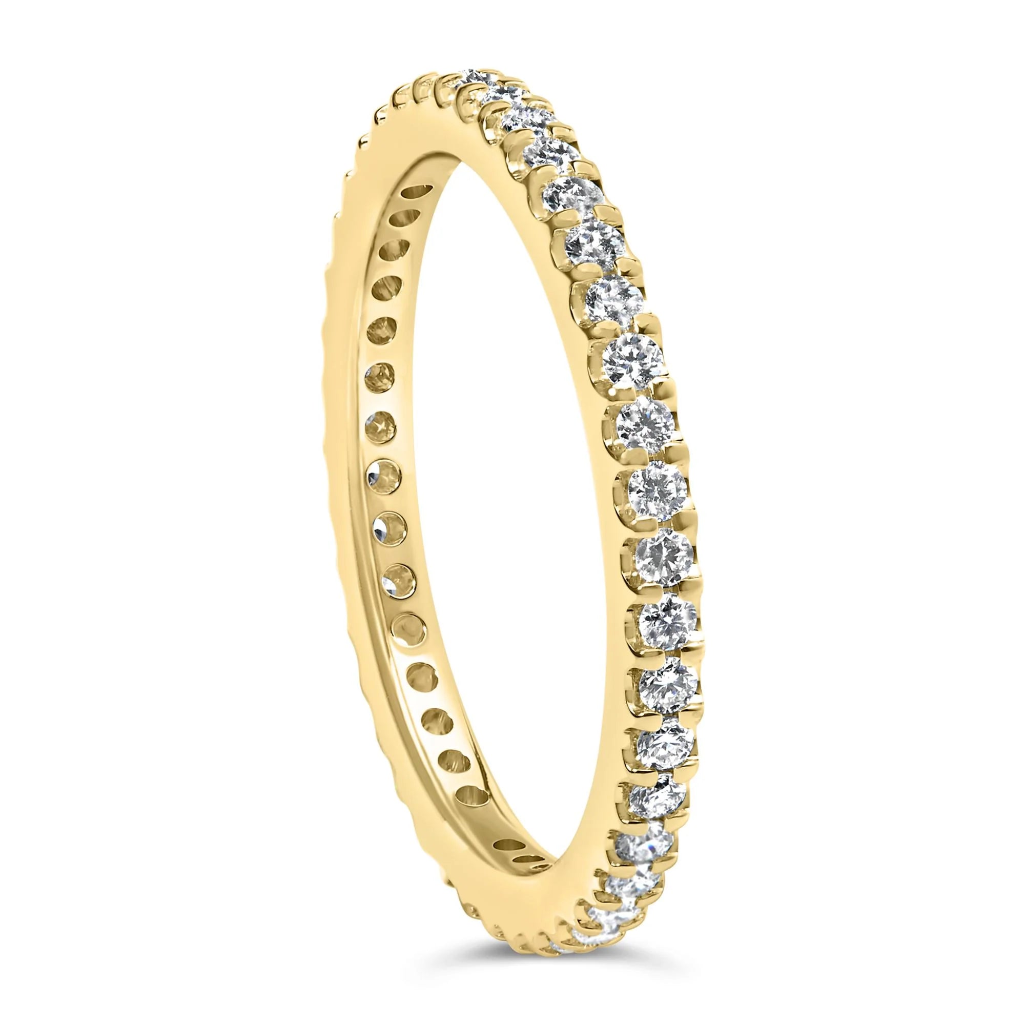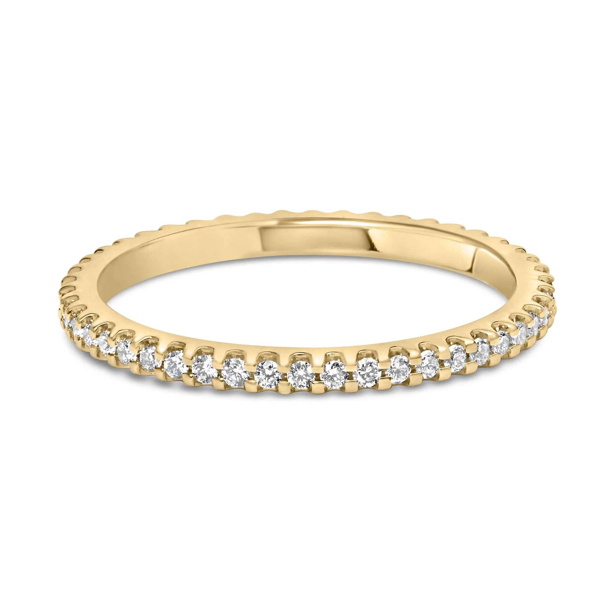 Imagine the eternal symbol of love and commitment gracing your finger, this dazzling ring epitomizes pure elegance and timeless sophistication. Every carefully selected natural diamond, with remarkable G-H color and SI1-SI2 clarity, radiates unparalleled brilliance, collectively weaving a lustrous tapestry of 1/3 carats around your finger. The expertly crafted 14K yellow gold band provides a radiant, yet subtle, backdrop, allowing the diamonds to truly sparkle in a shared prong setting that enhances their natural allure. Each stone is expertly secured, with the band's smooth interior and precise cutouts ensuring unrivaled comfort without compromising on security. This exquisite piece captures hearts not merely with its breathtaking beauty but with the story it tells; a story of eternal elegance, devotion, and impeccable craftsmanship, making it an unforgettable guardian of life's most precious moments. This eternity band is set with round-brilliant cut diamonds.