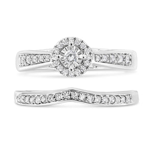 Immerse yourself in the timeless elegance of this rhodium-plated .925 sterling silver engagement ring set, where classic craftsmanship meets contemporary design. Each piece gleams with natural diamonds, sumptuously detailed to captivate and enchant. At the heart of the engagement ring, a prized 1/20 cttw diamond, meticulously set in a miracle plate, flaunts the grand illusion of a majestic solitaire. Encircling this centerpiece is a luminous halo of smaller diamonds, their sparkle mirrored in the pave shank that dances with light at every gesture. Complementing this luminance, the wedding band contours with a chic chevron V shape, sculpted to sit flush against its counterpart, reflecting unity and grace. This set not only promises a daily dose of luxury but a lifetime of love, preserved in the sheen of sterling silver and the brilliance of thoughtfully sourced natural diamonds. Celebrate your journey together with this symbol of enduring love and commitment.