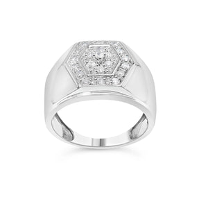 Discover a symbol of elegance and masculinity with this captivating .925 sterling silver ring, rhodium-plated to enhance its sophisticated luster. The unique hexagonal frame is meticulously filled with natural diamonds, each thoughtfully arranged in a multi-layered pattern that dances with light at every turn. Rated I-J for color and I3 for clarity, these diamonds boast a distinctive charm, marked by a sparkling celebration of imperfection. The wide band asserts a bold statement, making this piece not just a ring, but a testament to strength and durability. Ideal for the modern man who appreciates craftsmanship and the timeless allure of diamonds, this ring promises to be a remarkable addition to any ensemble, imbuing the wearer with an aura of confidence and style.