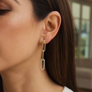 Each of these stunning 14k yellow gold paperclip chain link earrings features one stunning link encircled by sparkling diamonds. Earrings are held in place by pushback clasps. Total weight of diamonds is .63ct.