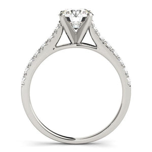This round diamond ring showcases a classic prong setting with a single row shank stone design. Fabulously crafted in fine 14k white gold.