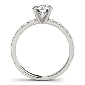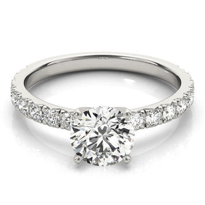 A delightful round prong set diamond ring with an intricately set single row band. Designed in 14k white gold.